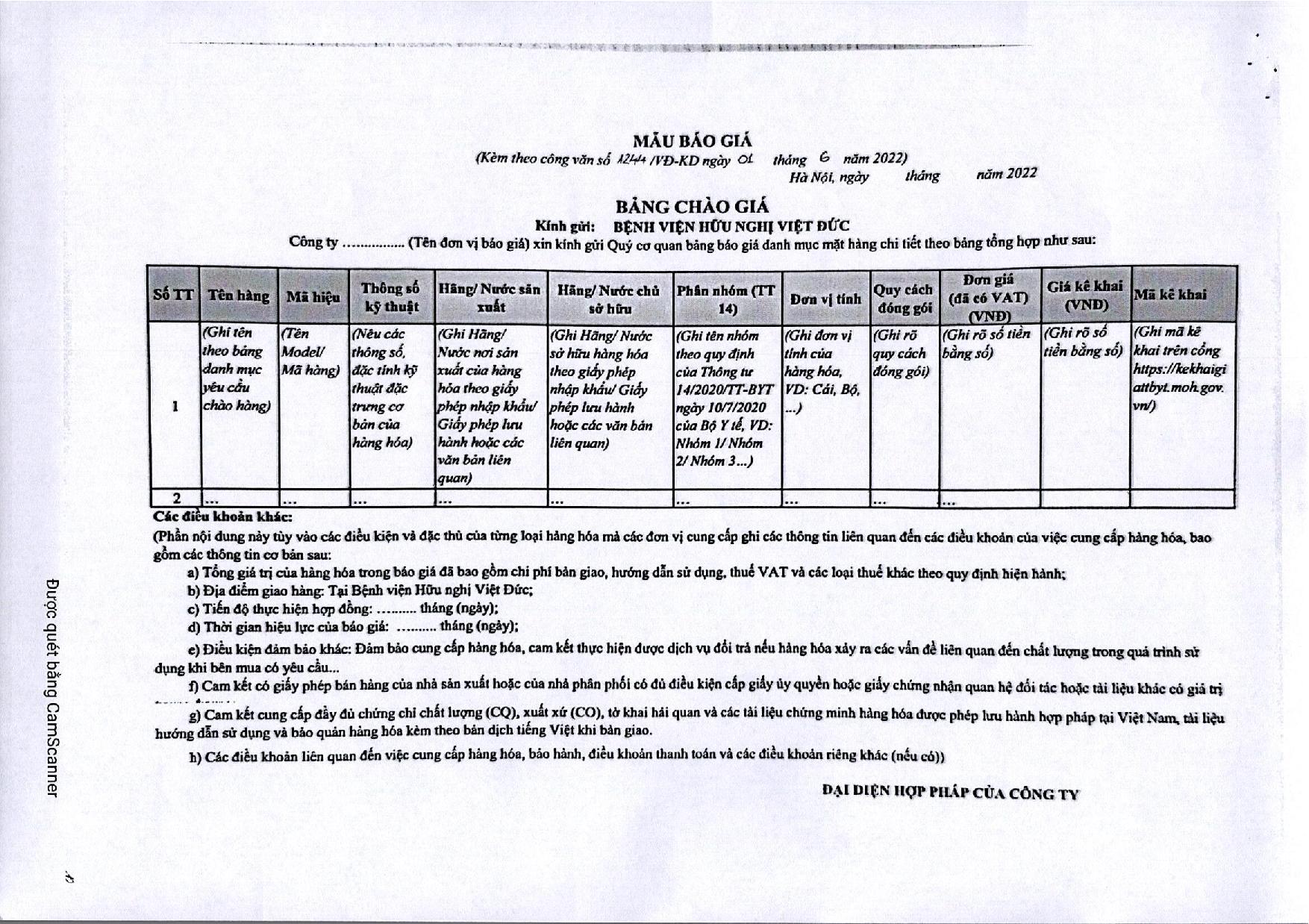 Bệnh viện Hữu nghị Việt Đức mời chào giá một số hóa chất phục vụ công tác chuyên môn tại bệnh viện