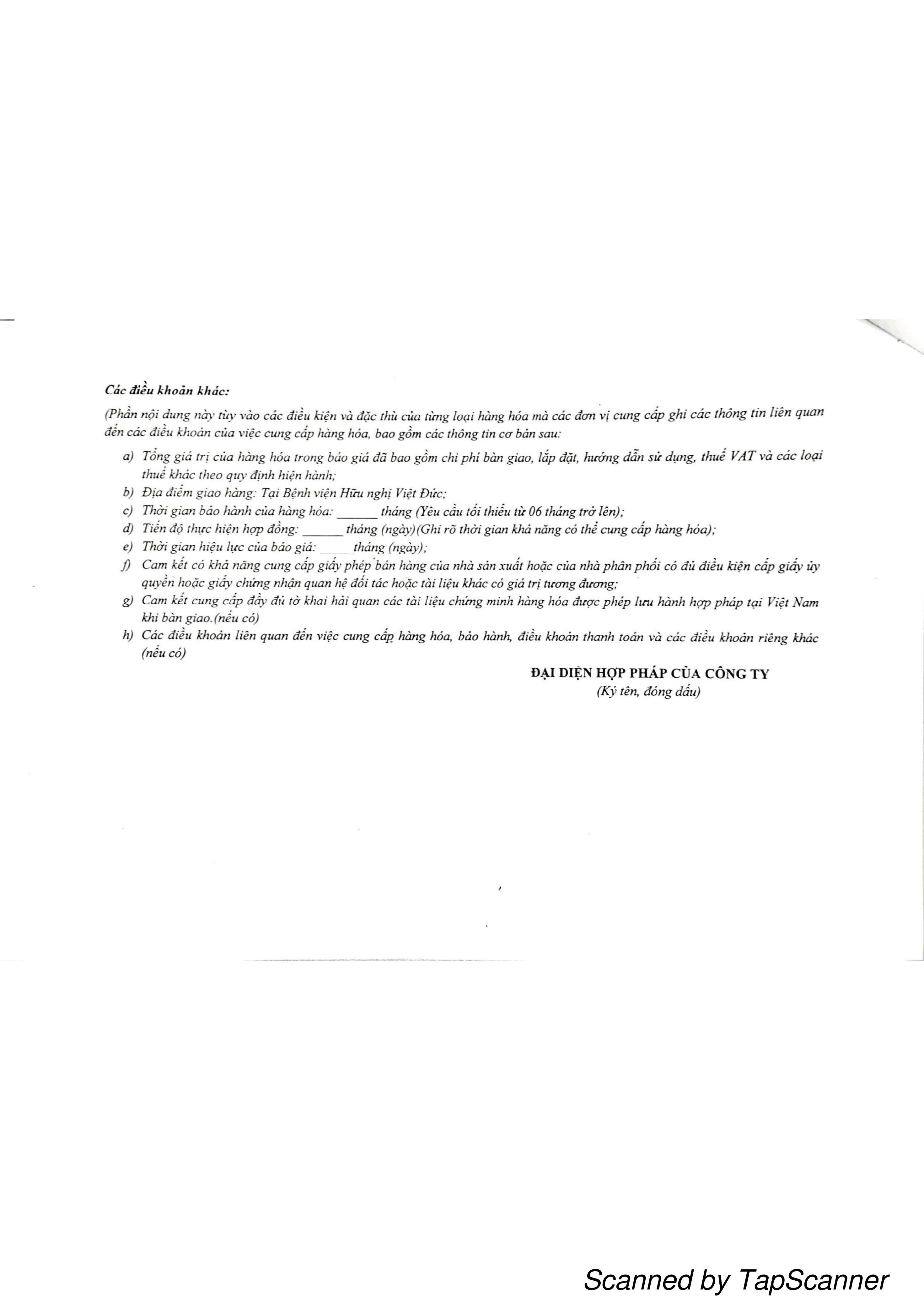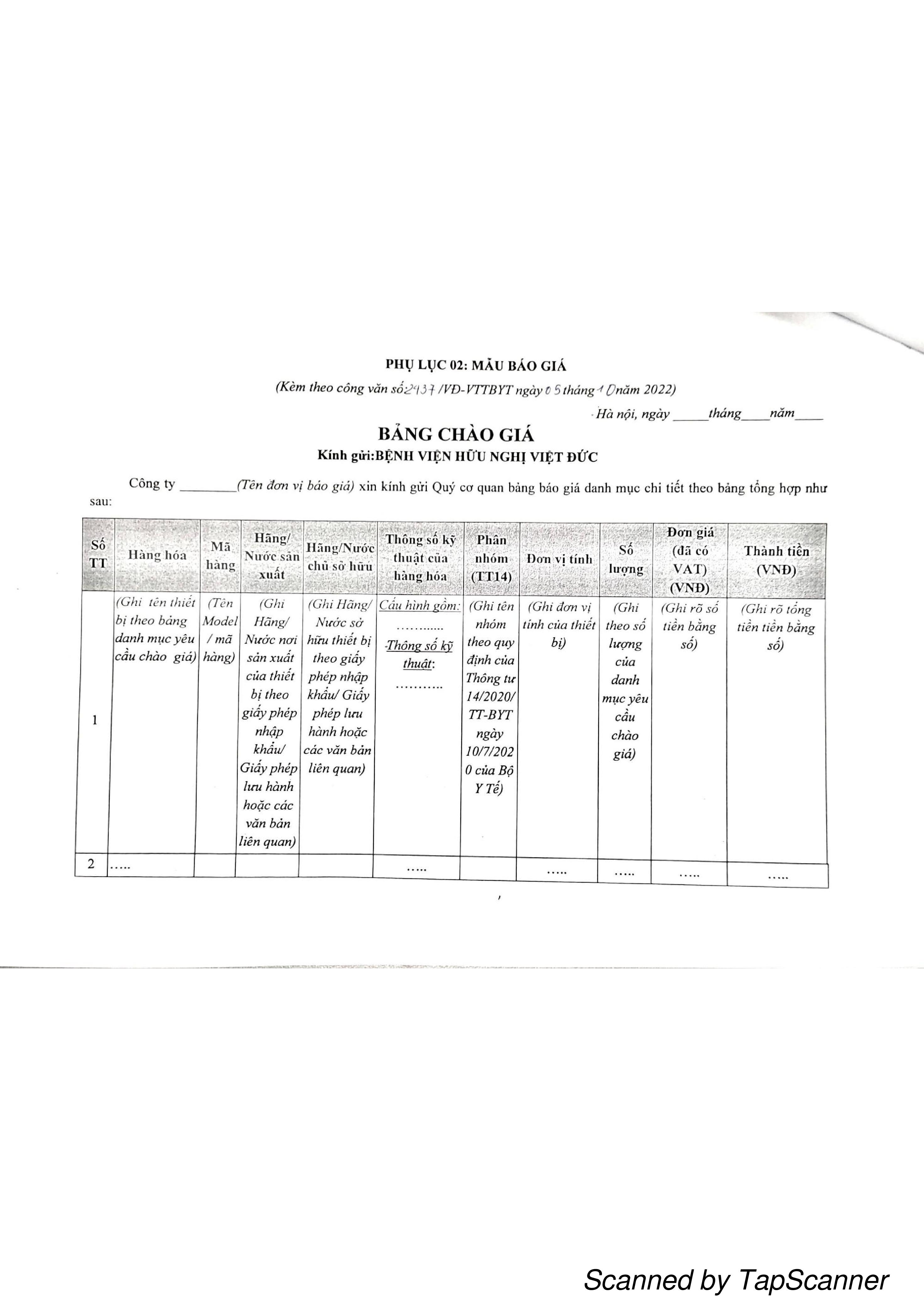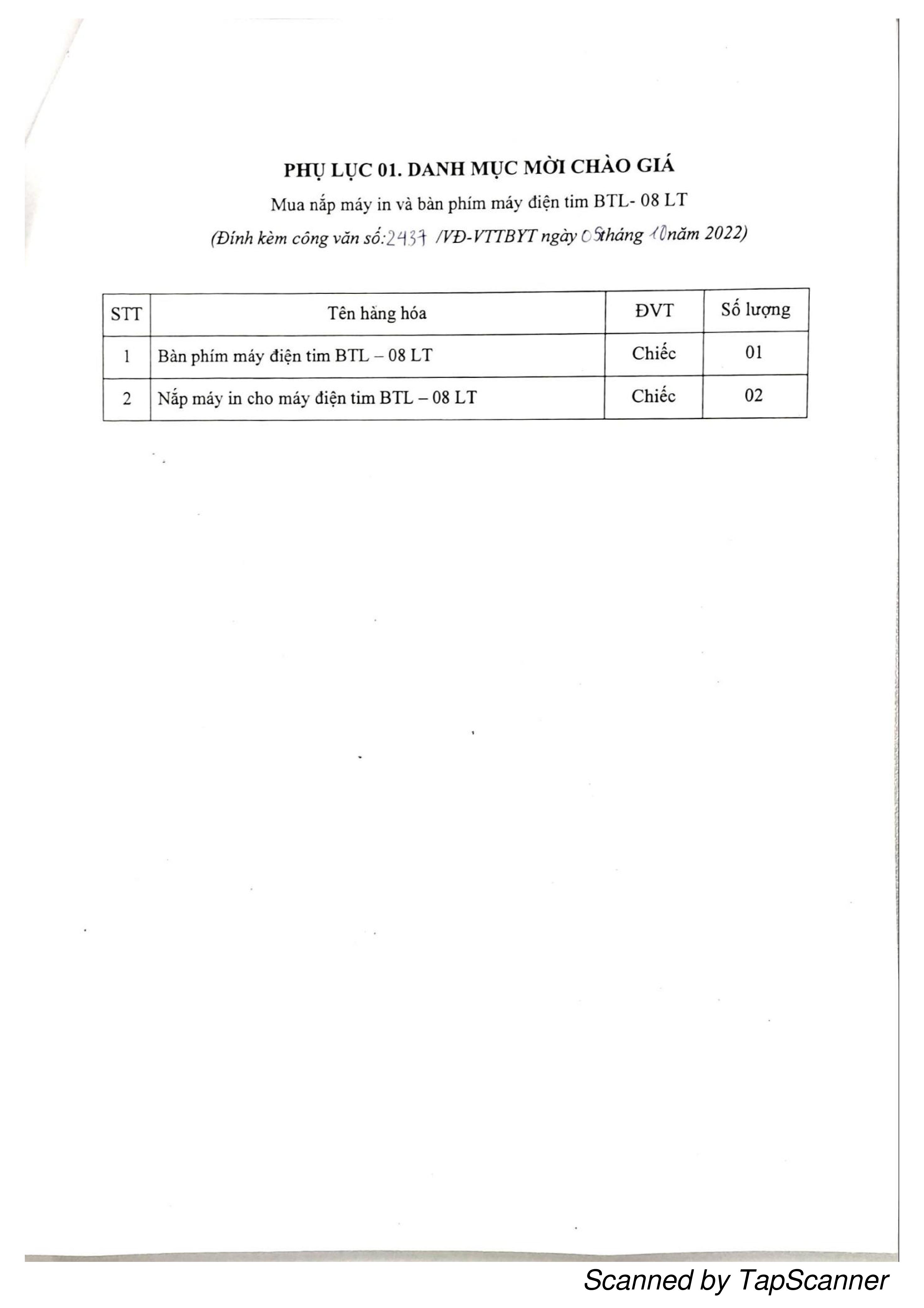 Hiện nay, Bệnh viện Hữu nghị Việt Đức đang có nhu cầu mua nắp máy in và bàn phím máy điện tim BTL- 08LT(chi tiết nội dung tại phụ lục 1 kèm theo), để có cơ sở tham khảo giá trên thị trường, Bệnh viện Hữu nghị Việt Đức mời các đơn vị, doanh nghiệp kinh doanh có khả năng cung cấp chào giá theo phụ lục 2 đính kèm.