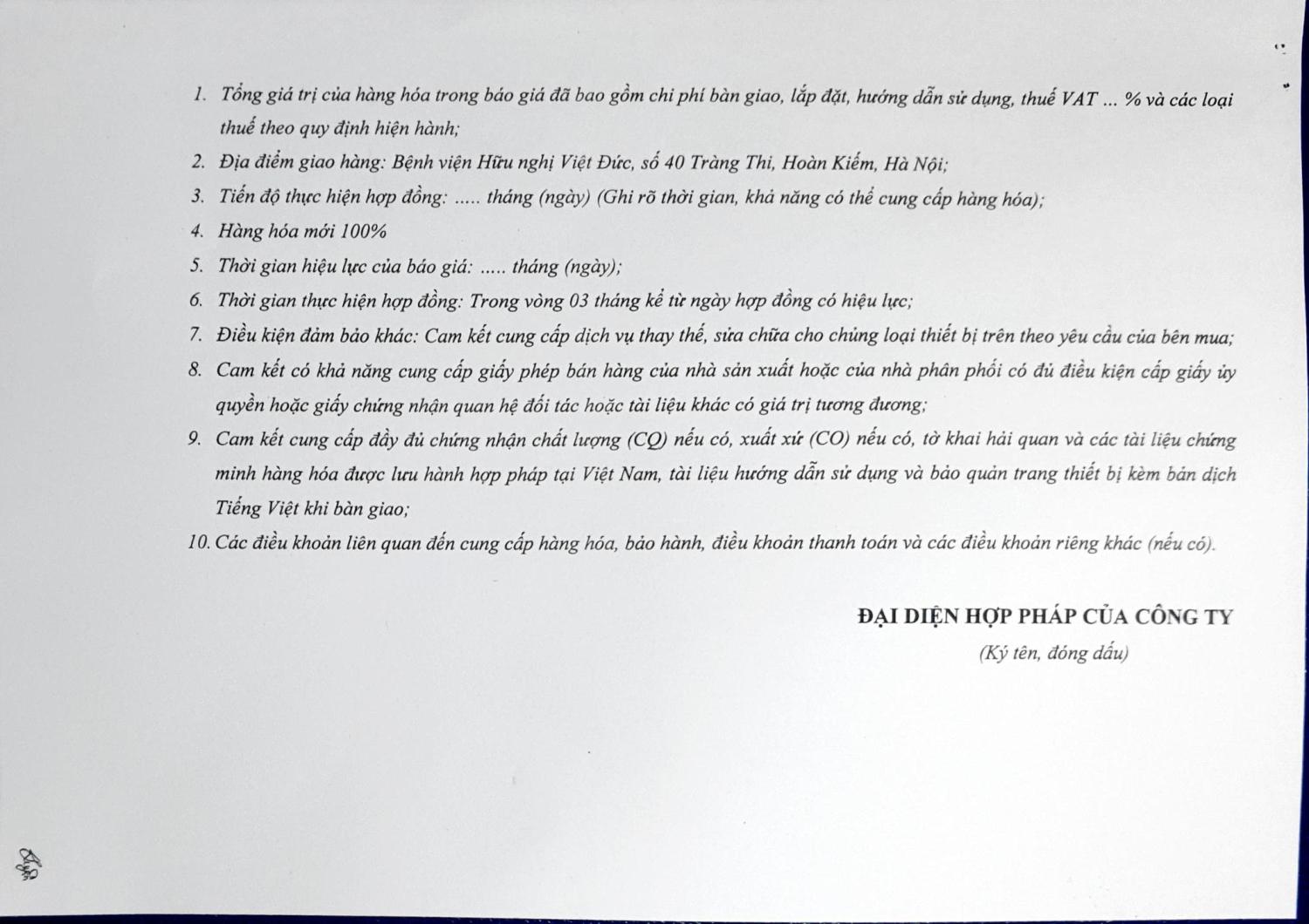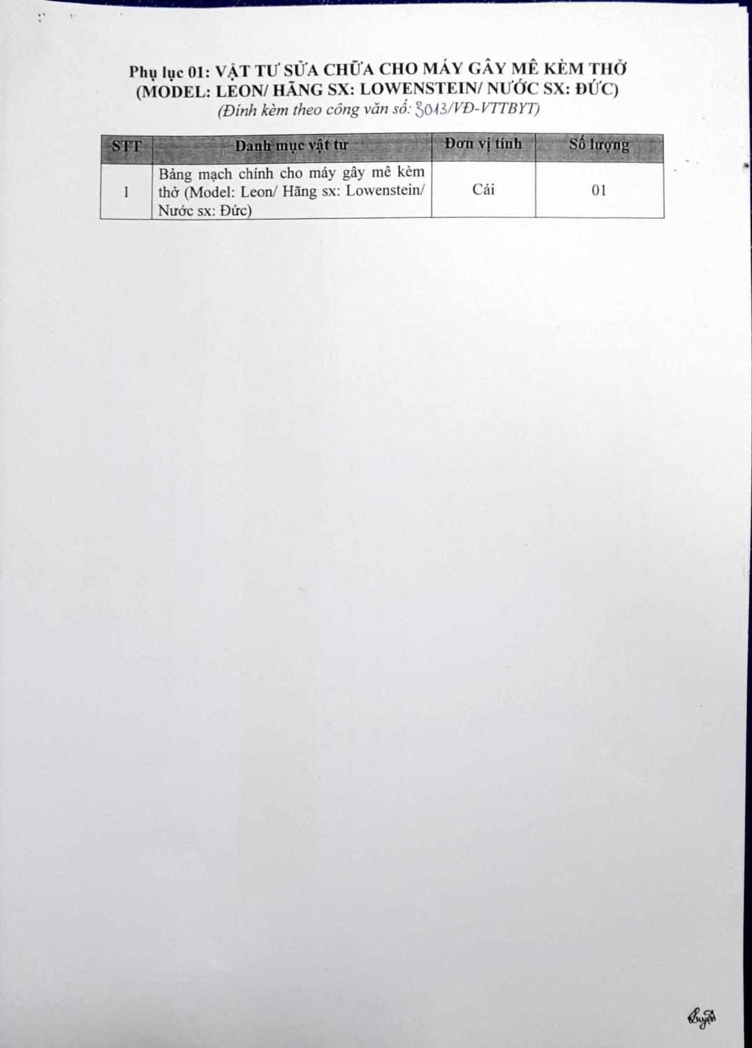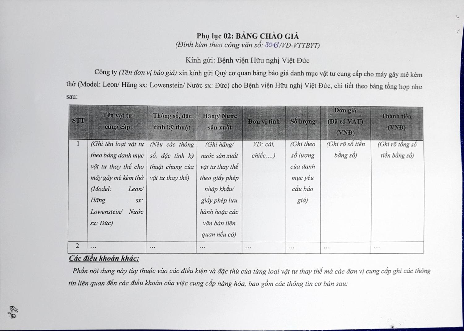 Hiện nay, Bệnh viện Hữu nghị Việt Đức đang có nhu cầu sửa 01 máy gây mê kèm thở (Model: Leon/ Hãng sx: Lowenstein/ Nước sx: Đức) để phục vụ công tác chuyên môn của Bệnh viện, chi tiết nội dung tại phụ lục kèm theo công văn này. Để có cơ sở tham khảo giá các đơn vị có khả năng cung cấp vật tư sửa chữa y tế trên thị trường, Bệnh viện Hữu nghị Việt Đức mời các đơn vị, doanh nghiệp kinh doanh có khả năng sửa chữa chào giá theo phụ lục 2 đính kèm.