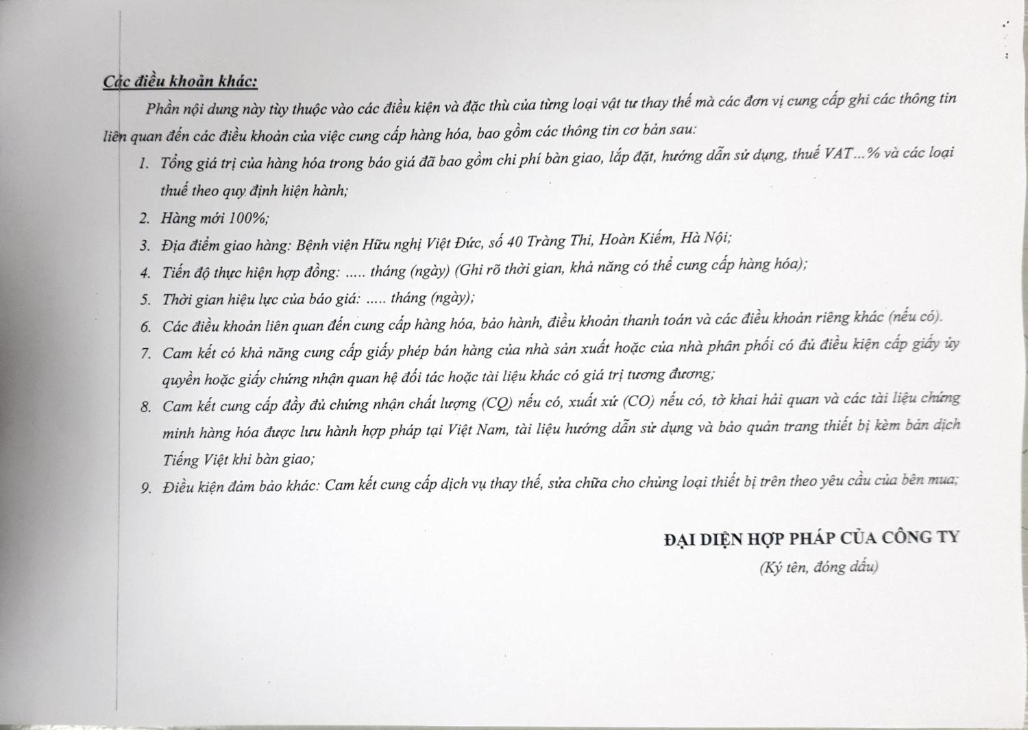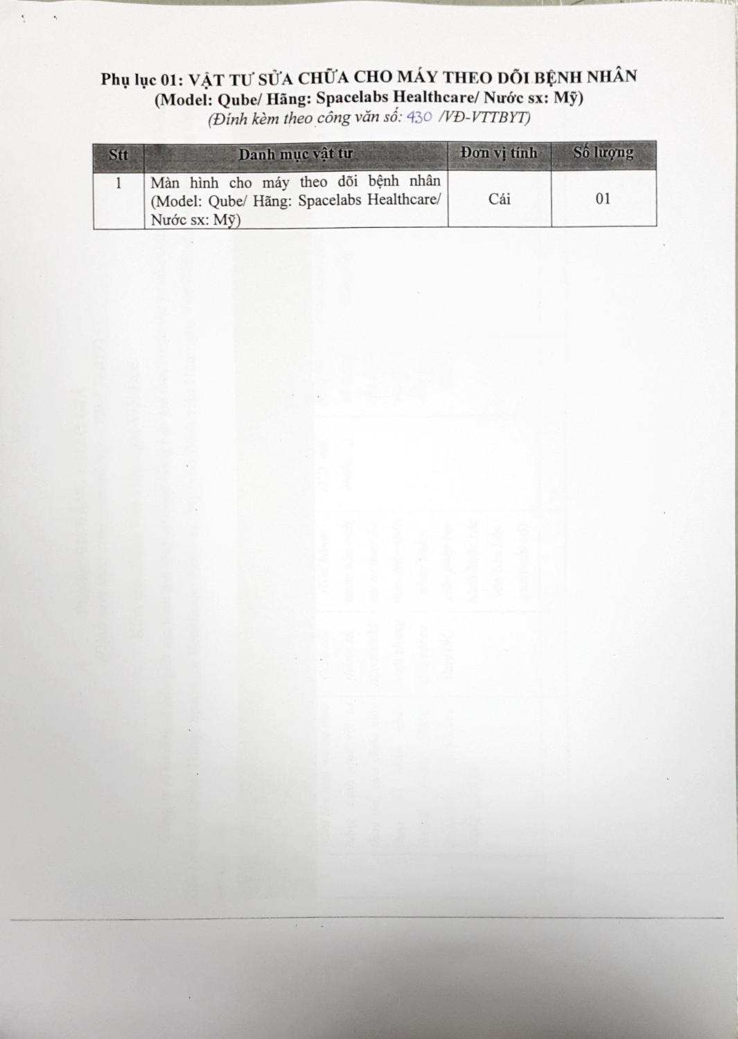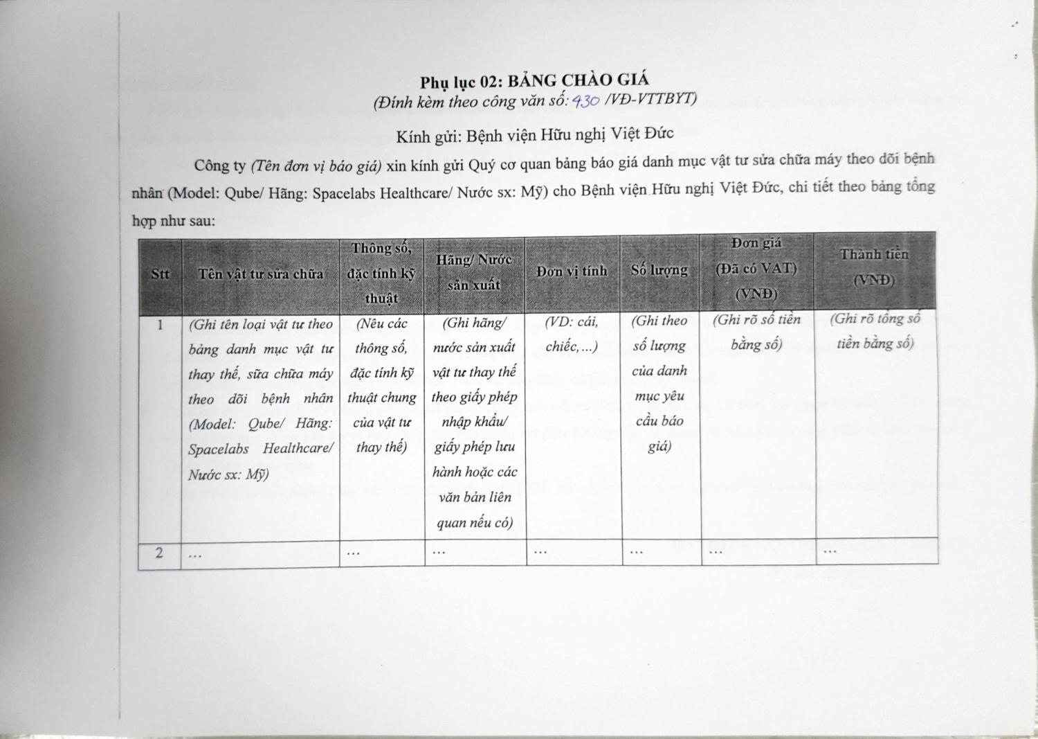 Hiện nay, Bệnh viện Hữu nghị Việt Đức đang có nhu cầu sửa 01 máy theo dõi bệnh nhân (Model: Qube/ Hãng: Spacelabs Healthcare/ Nước sx: Mỹ) để phục vụ công tác chuyên môn của Bệnh viện, chi tiết nội dung tại phụ lục kèm theo công văn này. Để có cơ sở tham khảo giá các đơn vị có khả năng cung cấp vật tư sửa chữa y tế trên thị trường, Bệnh viện Hữu nghị Việt Đức mời các đơn vị, doanh nghiệp kinh doanh có khả năng sửa chữa chào giá theo phụ lục 2 đính kèm.