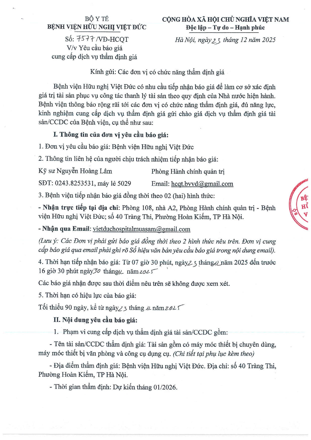 Bệnh viện Hữu nghị Việt Đức mời chào báo giá TTBYT