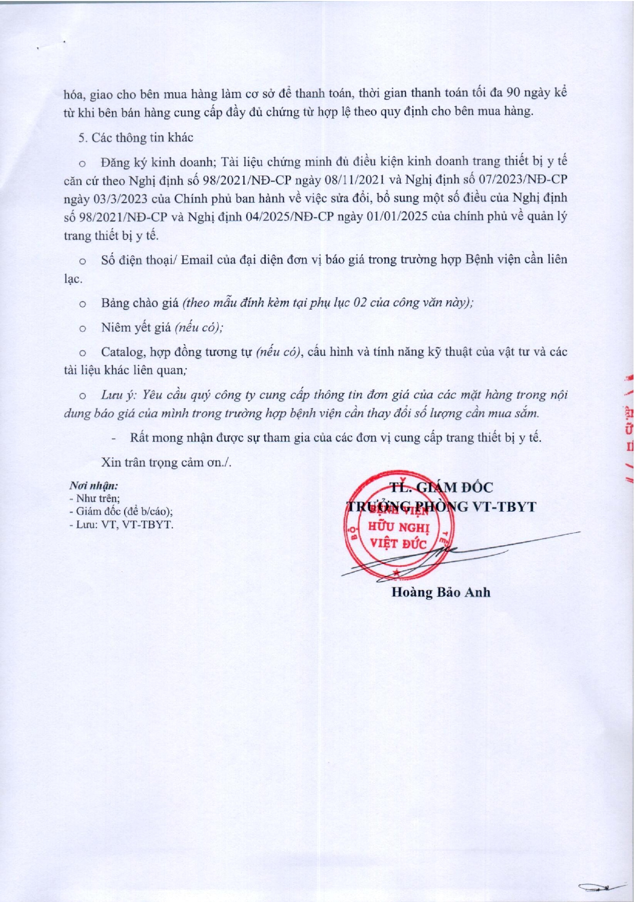 Bệnh viện Hữu nghị Việt Đức có nhu cầu tiếp nhận báo giá để tham khảo, xây dựng giá gói thầu, làm cơ sở mua sắm thiết bị y tế với nội dung cụ thể như sau: TẠI ĐÂY