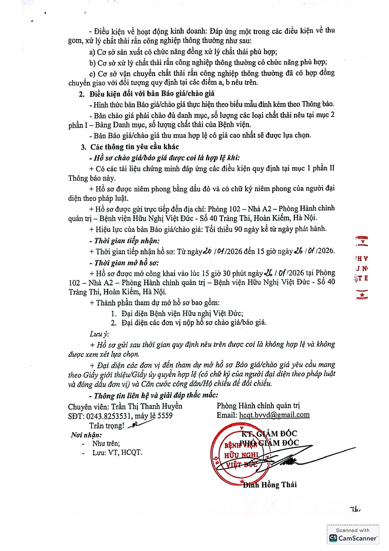 Hiện nay, Bệnh viện Hữu Nghị Việt Đức (Bệnh viện) có nhu cầu lựa chọn Đơn vị/Tổ chức/Doanh nghiệp thu mua các chất thải rắn y tế thông thường được phép thu gom phục vụ mục đích tái chế theo quy định pháp luật nhằm mục đích ký hợp đồng chuyển giao chất thải rắn y tế thông thường được phép thu gom phục vụ mục đích tái chế năm 2026-2027.
