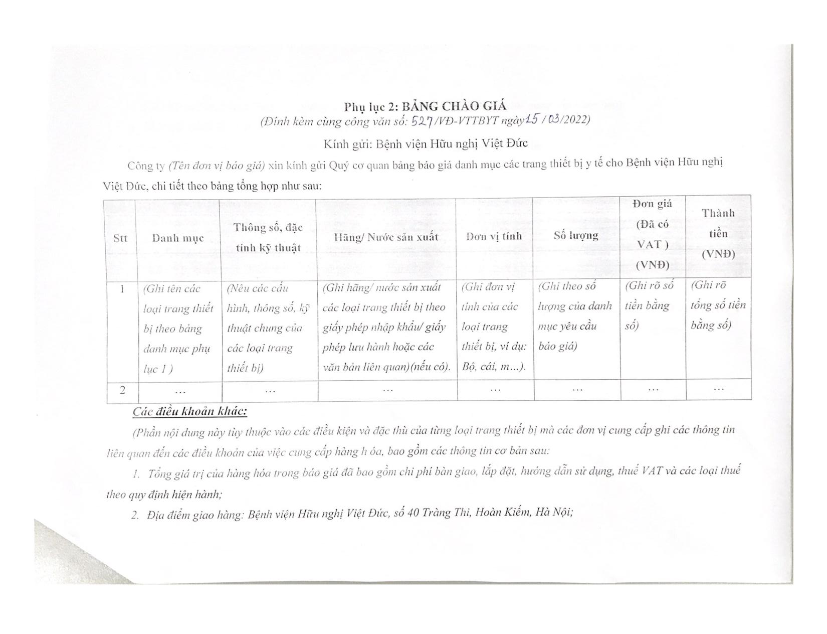 Bệnh viện Hữu nghị Việt Đức mời chào giá trang thiết bị y tế
