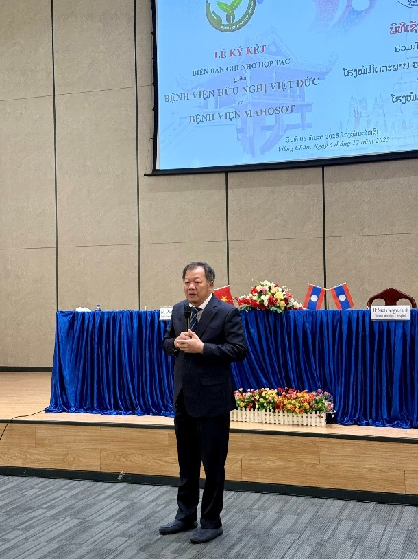 Ngày 06/12/2025, tại Thủ đô Viêng Chăn – Lào, đoàn công tác của Bệnh viện Hữu nghị Việt Đức do PGS.TS Dương Đức Hùng – Giám đốc bệnh viện làm trưởng đoàn, đã thăm và làm việc tại Bệnh viện Trung ương Quân đội 103 và Bệnh viện Mahosot.