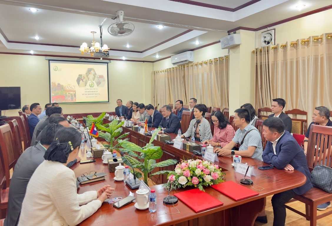 Trong khuôn khổ chuyến công tác, Bệnh viện Hữu nghị Việt Đức đã tiến hành ký kết Biên bản ghi nhớ hợp tác chuyên môn với Bệnh viện Trung ương Quân đội 103 (Viêng Chăn – Lào) và Bệnh viện Mahosot. Lễ ký kết được diễn ra trong không khí trang trọng, hữu nghị, thể hiện mối quan hệ truyền thống tốt đẹp giữa Việt Nam – Lào nói chung và giữa các bệnh viện nói riêng. Các bên cùng thống nhất tăng cường chia sẻ kinh ngiệm chuyên môn, phối hợp đào tạo nguồn nhân lực y tế, hỗ trợ hội chẩn – cấp cứu từ xa cũng như hợp tác trong nghiên cứu khoa học và chuyển giao kỹ thuật.