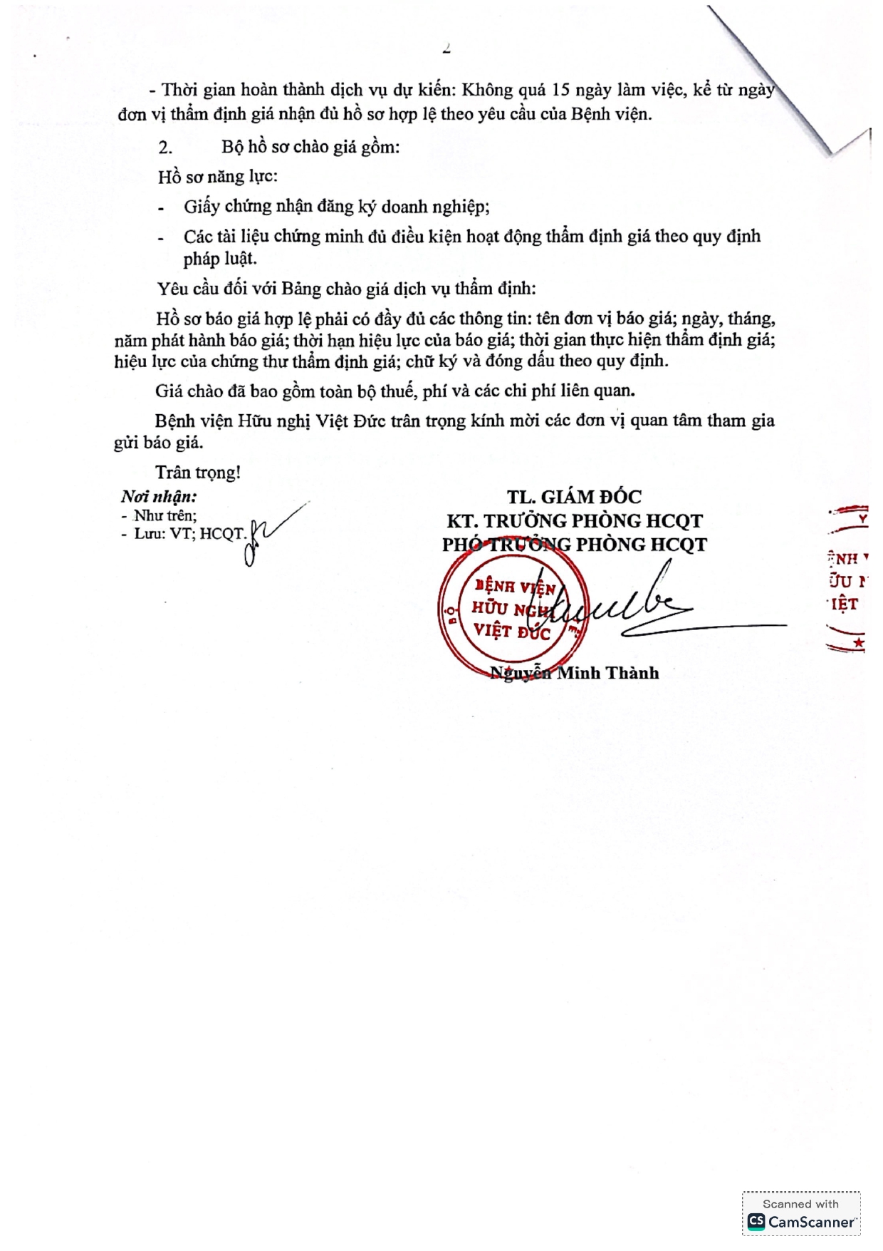 Bệnh viện Hữu nghị Việt Đức có nhu cầu tiếp nhận báo giá để làm cơ sở xác định giá trị tài sản phục vụ công tác thanh lý tài sản theo quy định của Nhà nước hiện hành. Bệnh viện thông báo rộng rãi tới các đơn vị có chức năng thẩm định giá, đủ năng lực, kinh nghiệm cung cấp dịch vụ thẩm định giá gửi chào giá dịch vụ thẩm định giá tài sản/CCDC của Bệnh viện, cụ thể như sau: