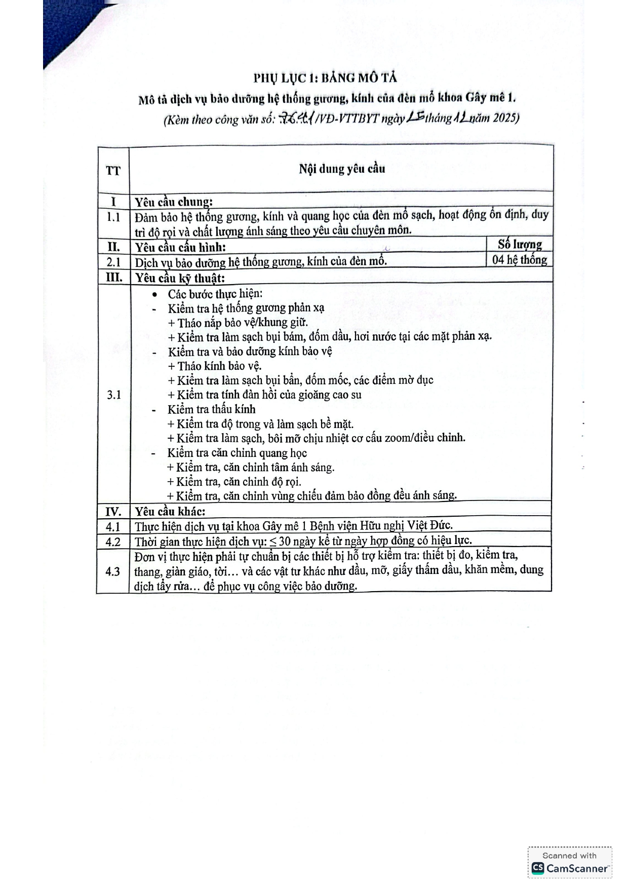 Bệnh viện Hữu nghị Việt Đức có nhu cầu tiếp nhận báo giá để tham khảo, xây dựng giá gói thầu, làm cơ sở tổ chức lựa chọn nhà thầu cho dịch vụ bảo dưỡng hệ thống gương, kính của đèn mổ khoa Gây mê 1 với nội dung cụ thể như sau: