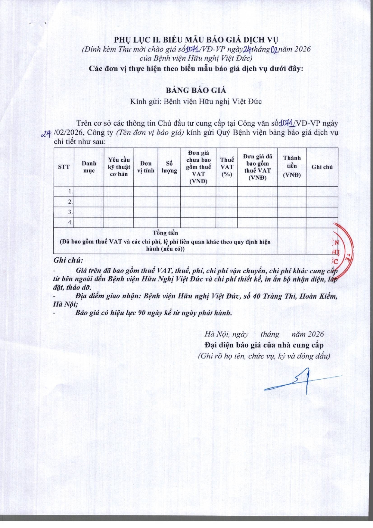 Hiện nay, Bệnh viện Hữu nghị Việt Đức có nhu cầu tiếp nhận báo giá để tham khảo, xây dựng giá gói thầu, làm cơ sở tổ chức lựa chọn nhà thầu cho gói thầu cung cấp dịch vụ thiết kế bộ nhận diện, in ấn phục vụ tổ chức hội thảo: “Hội chẩn đa chuyên khoa quốc tế về ung thu phổi” tại Bệnh viện Hữu nghị Việt Đức năm 2026, với nội dung cụ thể như sau: