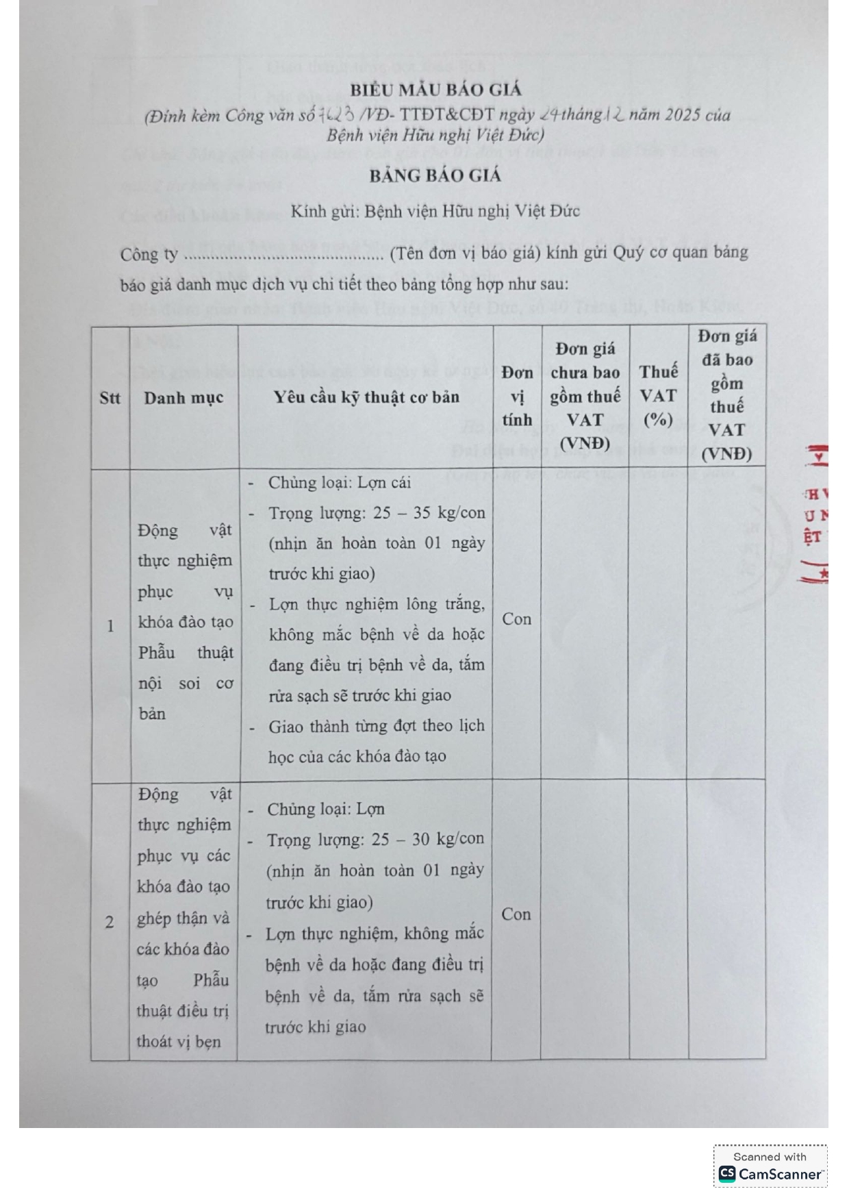 Bệnh viện Hữu nghị Việt Đức yêu cầu báo giá động vật thực nghiệm phục vụ các khoá đào tạo tại bệnh viện