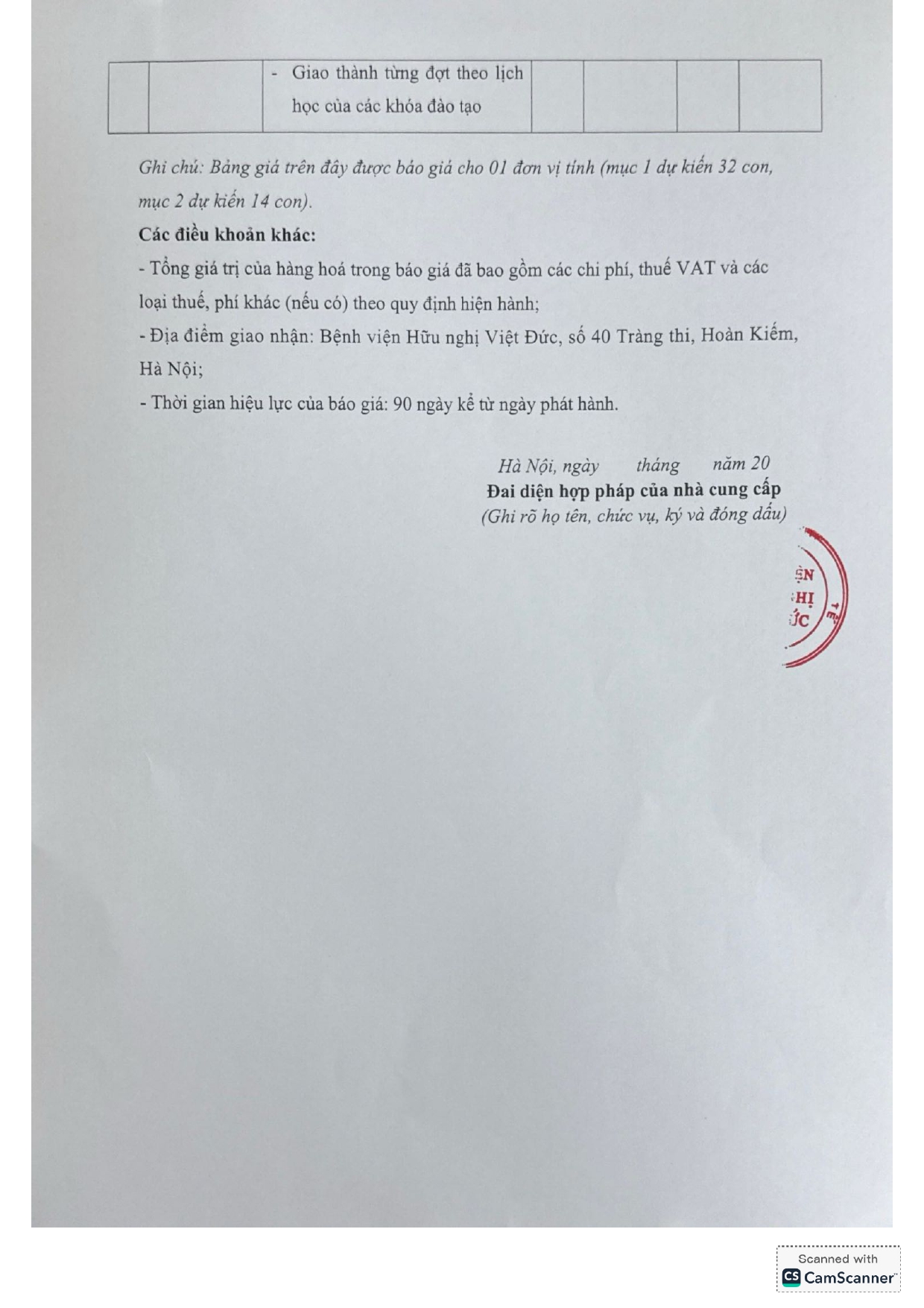 Hiện nay, Bệnh viện Hữu nghị Việt Đức có nhu cầu tiếp nhận báo giá để tham khảo, xây dựng giá gói thầu, làm cơ sở tổ chức lựa chọn nhà thầu cho gói thầu mua sắm động vật thực nghiệm phục vụ các khoá đào tạo tại bệnh viện, với nội dung cụ thể như sau: