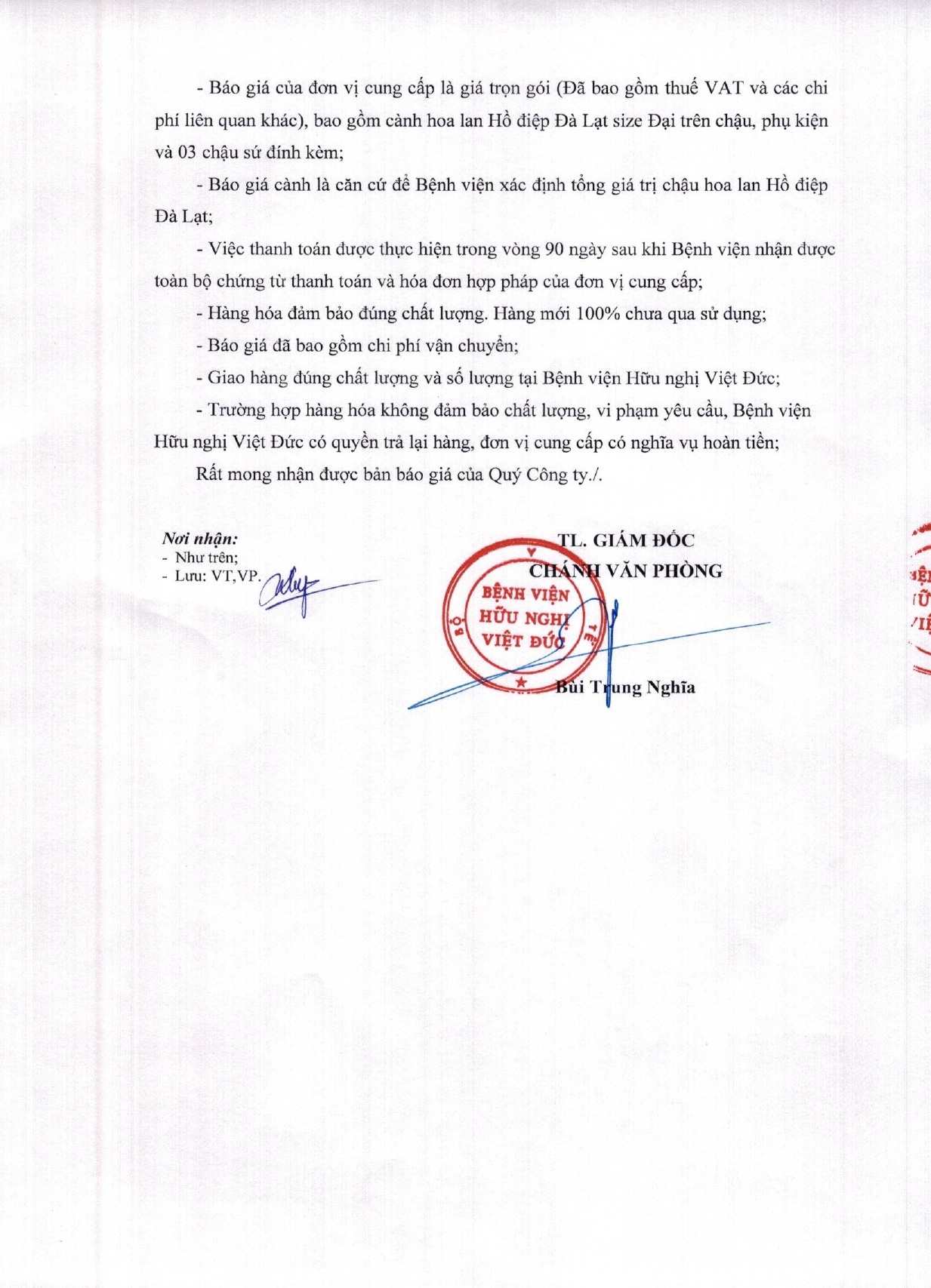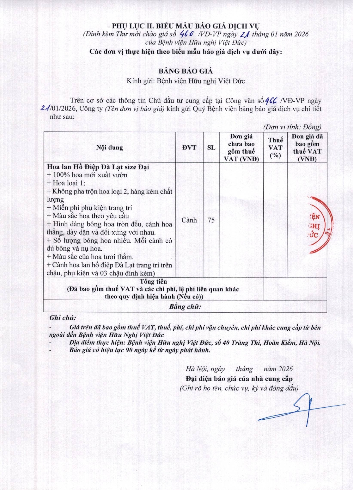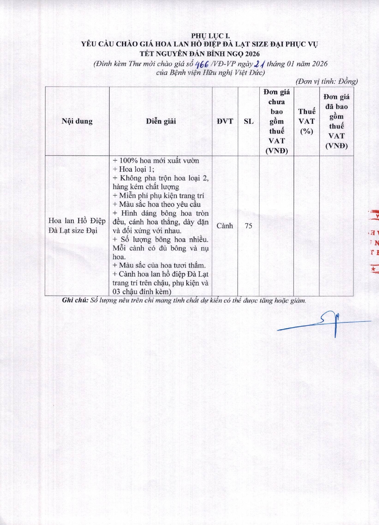 Bệnh viện Hữu nghị Việt Đức yêu cầu báo giá Hoa lan Hồ Điệp Đà Lạt size Đại phục vụ dịp Tết Nguyên đán Bính Ngọ 2026