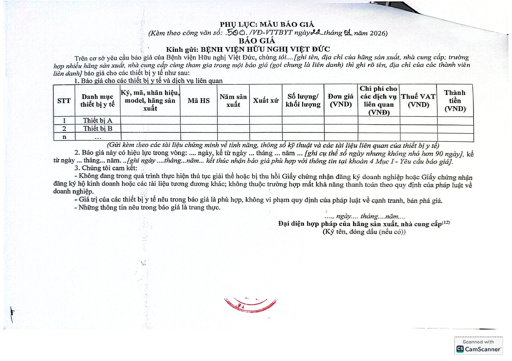 Bệnh viện Hữu nghị Việt Đức có nhu cầu tiếp nhận báo giá để tham khảo, xây dựng giá gói thầu, làm cơ sở tổ chức lựa chọn nhà thầu cho hồ sơ mua sắm linh kiện, phụ kiện, vật tư thay thế sử dụng cho trang thiết bị y tế với nội dung cụ thể như sau: