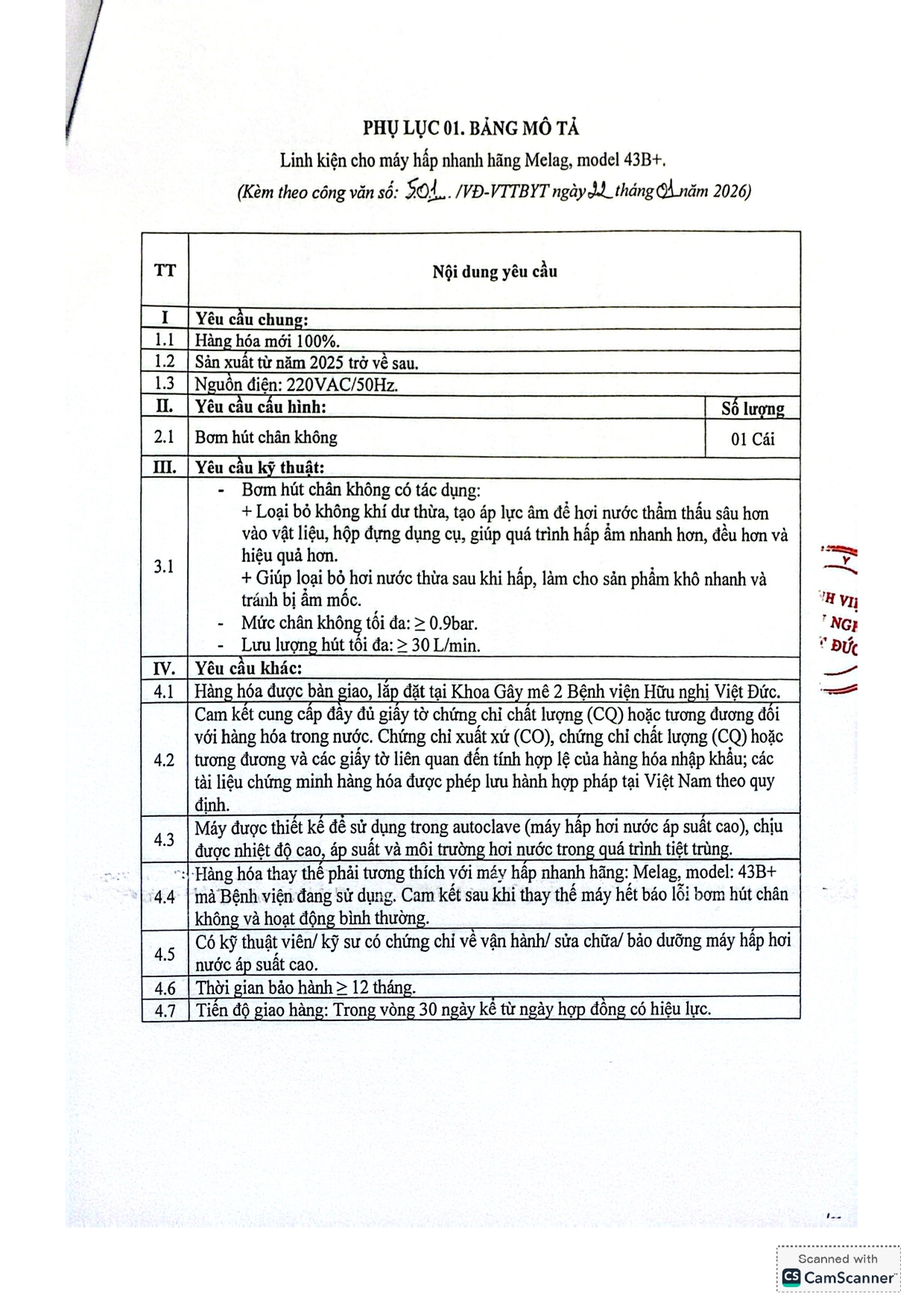 Bệnh viện Hữu nghị Việt Đức yêu cầu báo giá linh kiện cho máy hấp nhanh hãng Melag, model 43B+.