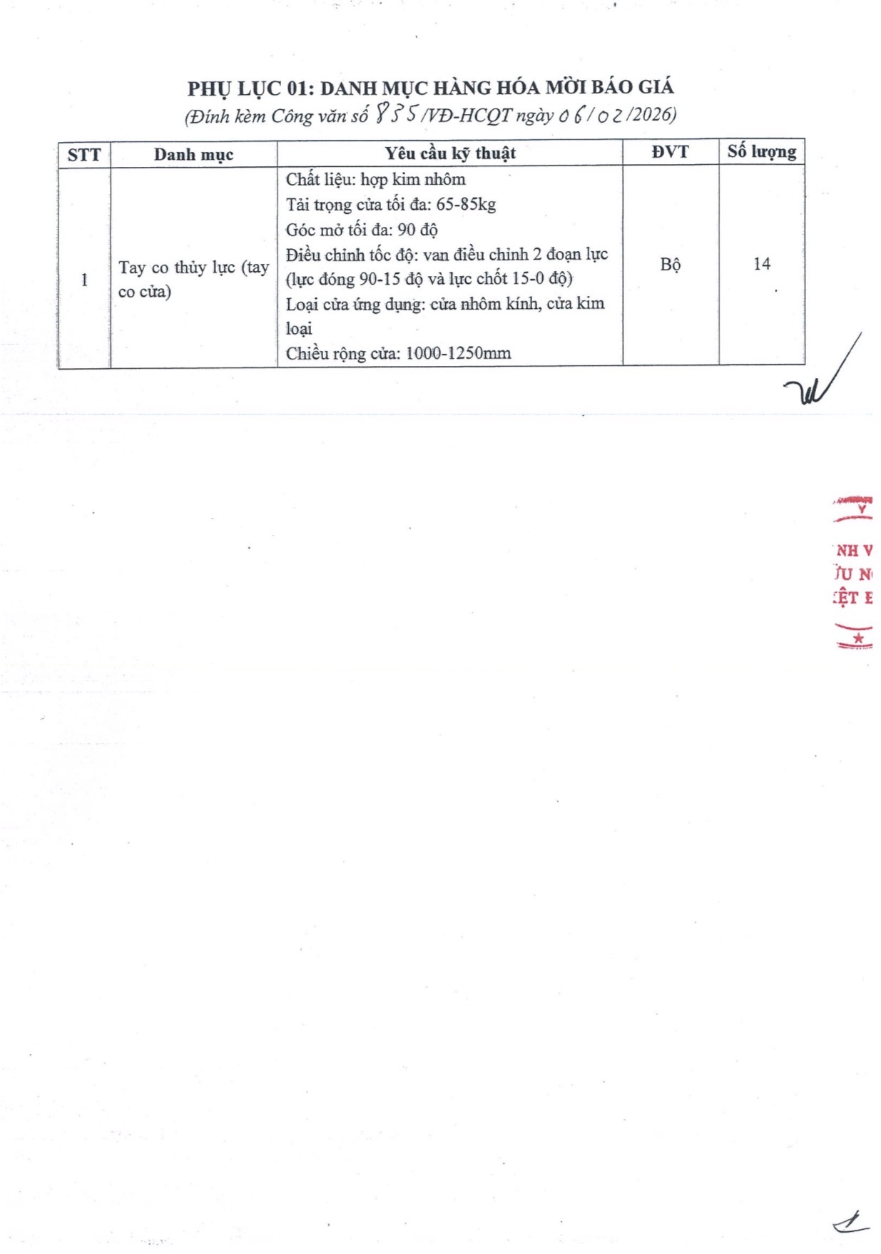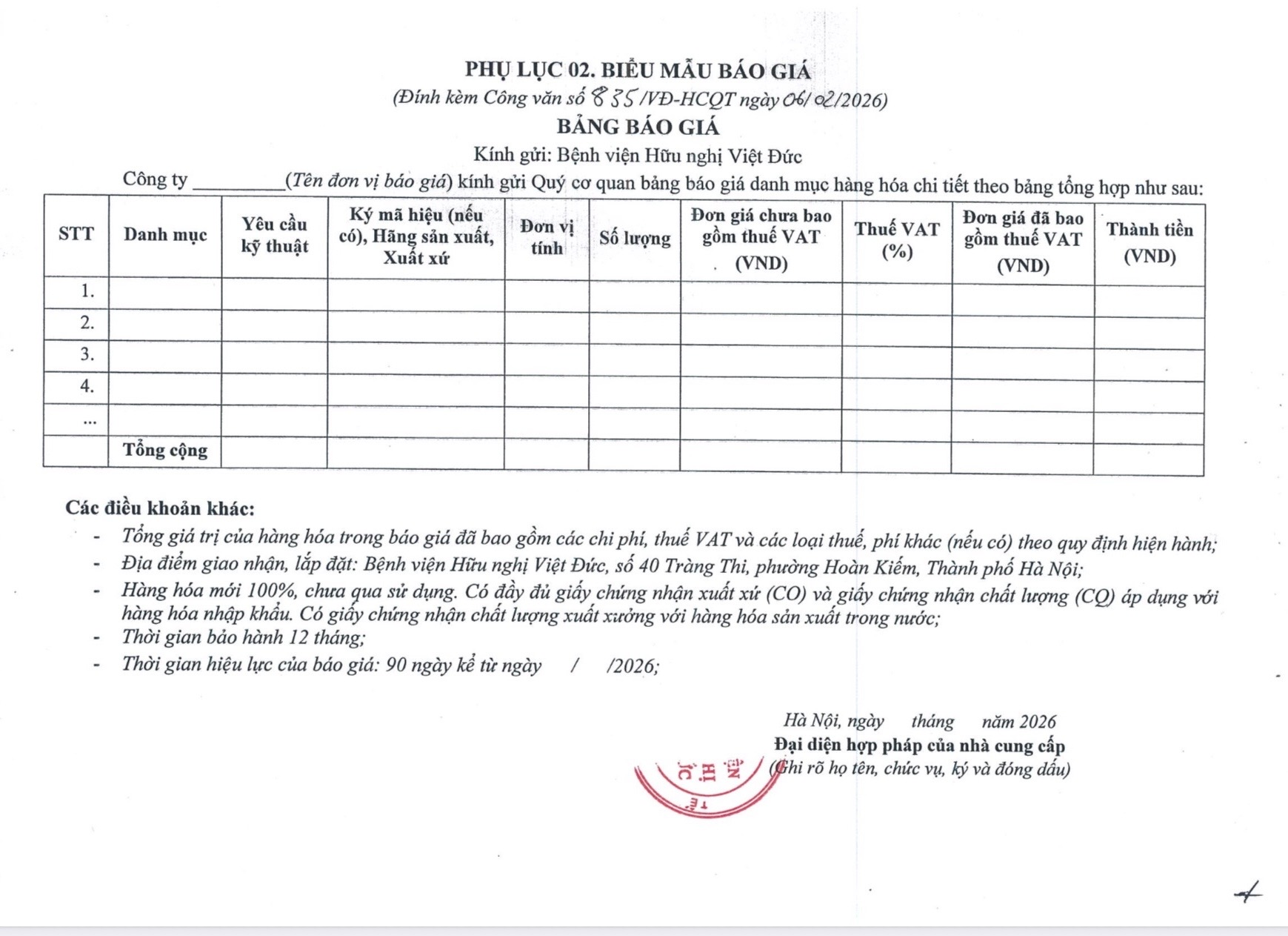 Hiện nay, Bệnh viện Hữu nghị Việt Đức có nhu cầu mua tay co thủy lực (tay co cửa) cho hệ thống cửa ra vào khu vệ sinh của khoa Gây mê 2 và Trung Tâm Ghép Tạng. Để có cơ sở tham khảo giá hàng hóa trên thị trường, Bệnh viện Hữu nghị Việt Đức kính mời các đơn vị có khả năng cung cấp tham gia báo giá với nội dung cụ thể như sau: