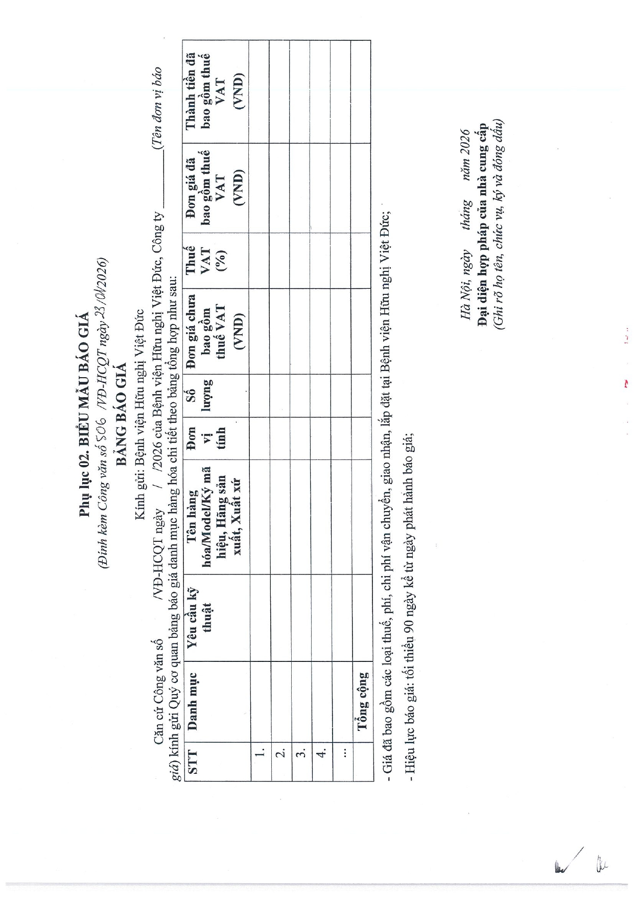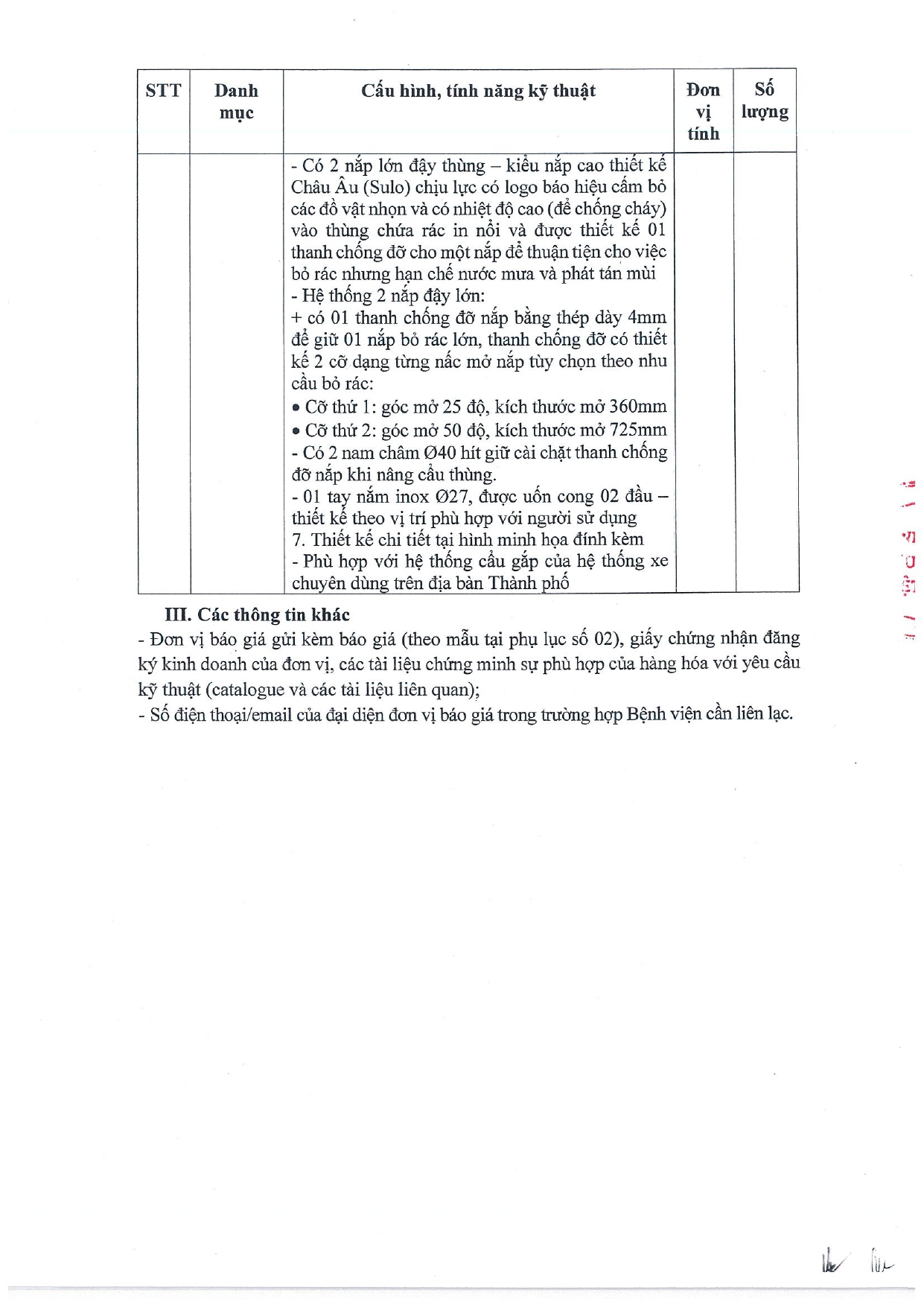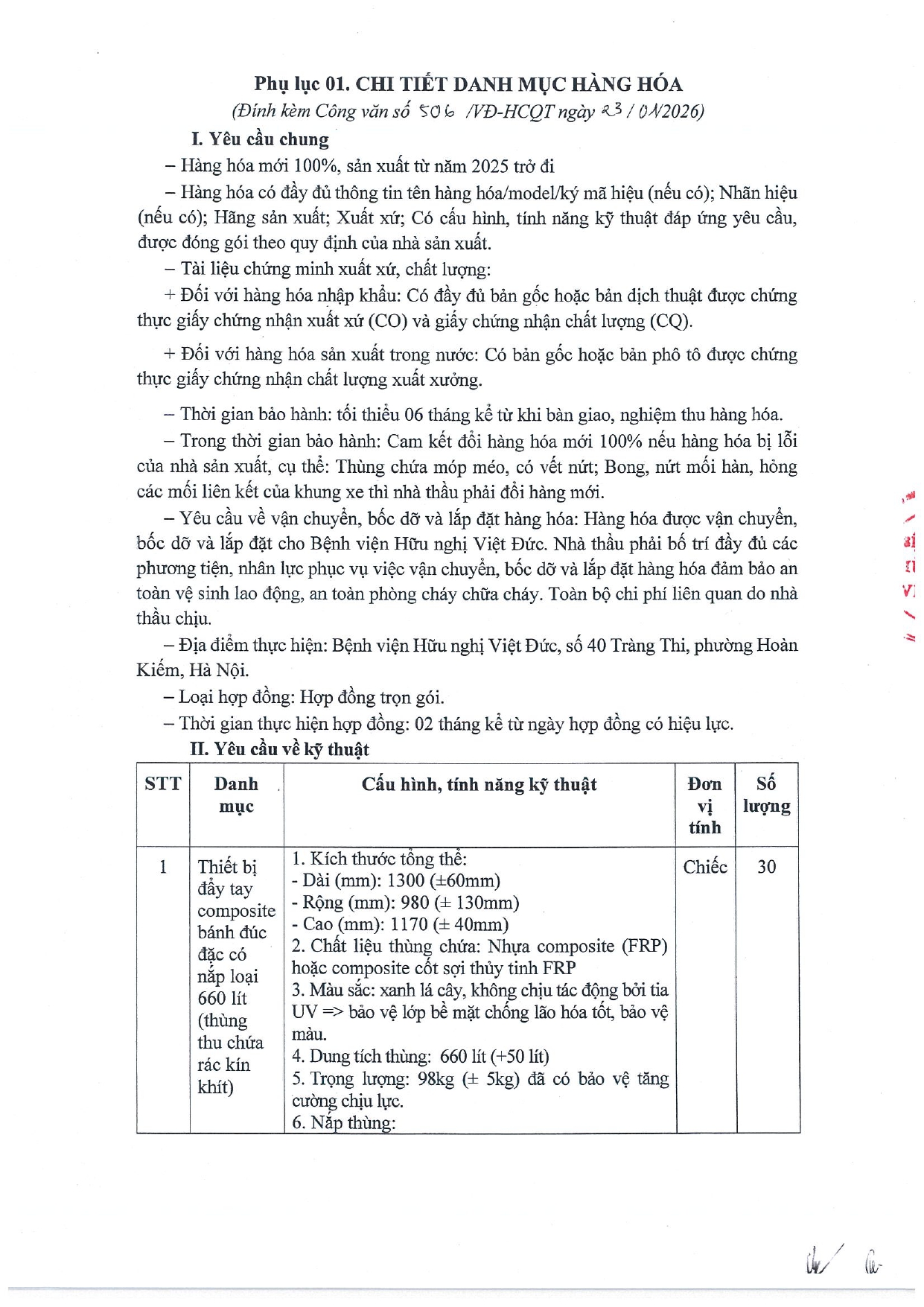 Hiện nay, Bệnh viện Hữu nghị Việt Đức có nhu cầu trang bị dụng cụ thu chứa chất thải sinh hoạt. Để có cơ sở tham khảo giá mặt hàng dụng cụ thu chứa chất thải sinh hoạt trên thị trường, Bệnh viện Hữu nghị Việt Đức kính mời các đơn vị có khả năng cung cấp báo giá mặt hàng trên với nội dung cụ thể như sau: