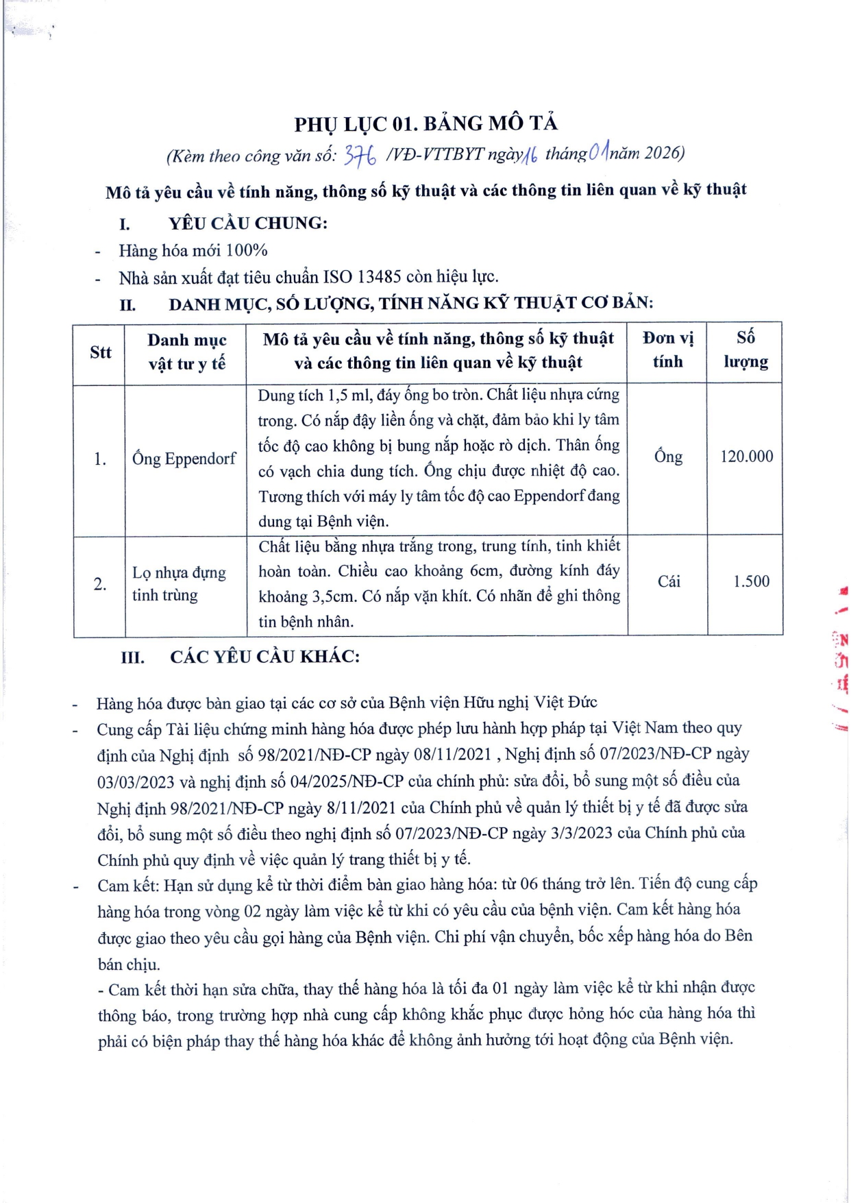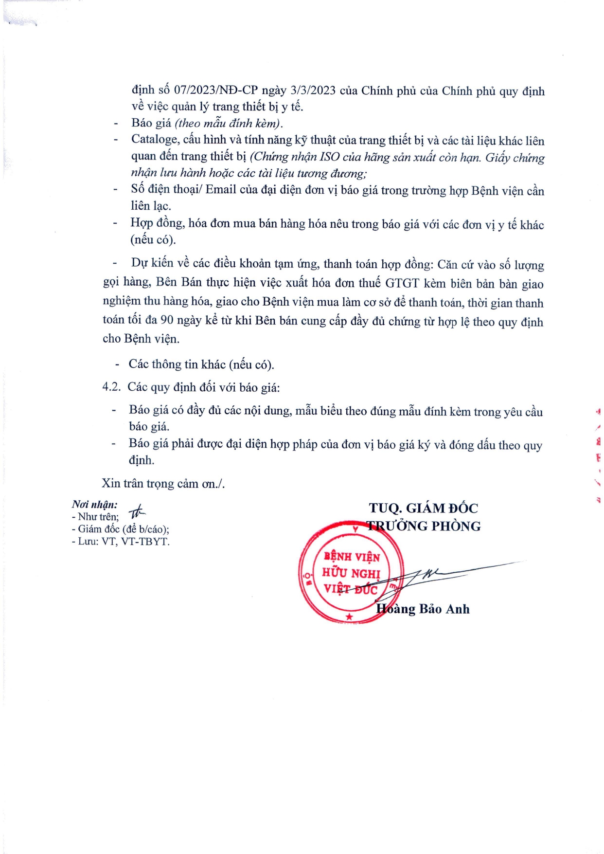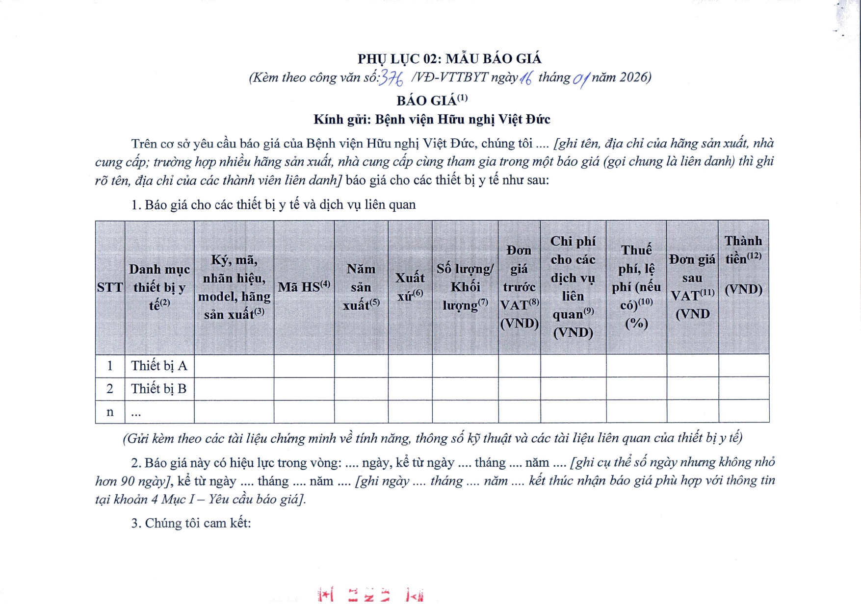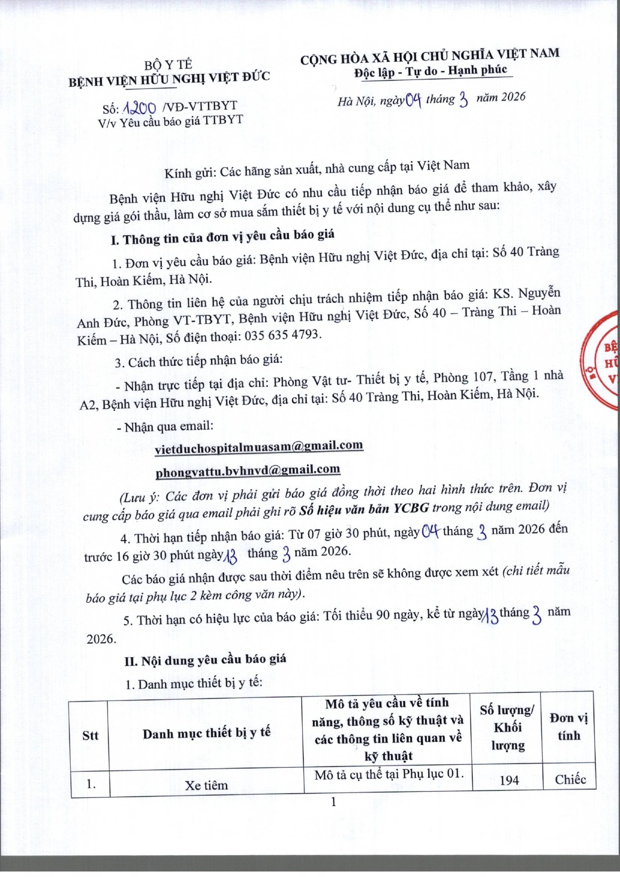 Bệnh viện Hữu nghị Việt Đức có nhu cầu tiếp nhận báo giá để tham khảo, xây dựng giá gói thầu, làm cơ sở mua sắm vật tư y tế với nội dung cụ thể như sau: