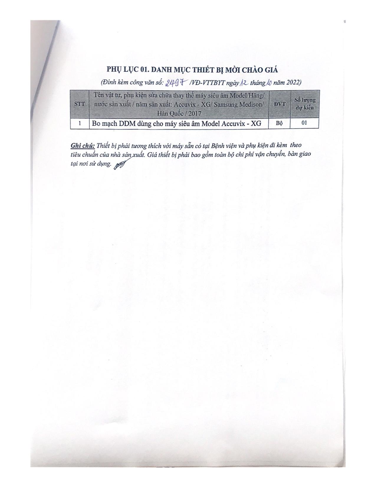 Hiện nay, Bệnh viện Hữu nghị Việt Đức đang có nhu cầu mua vật tư phục vụ sử chữa máy siêu âm Model/Hãng/ nước sản xuất / năm sản xuất: Accuvix – XG/ Samsung Medison/ Hàn Quốc / 2017 hiện hỏng bo mạch DDM cụ thể như sau: