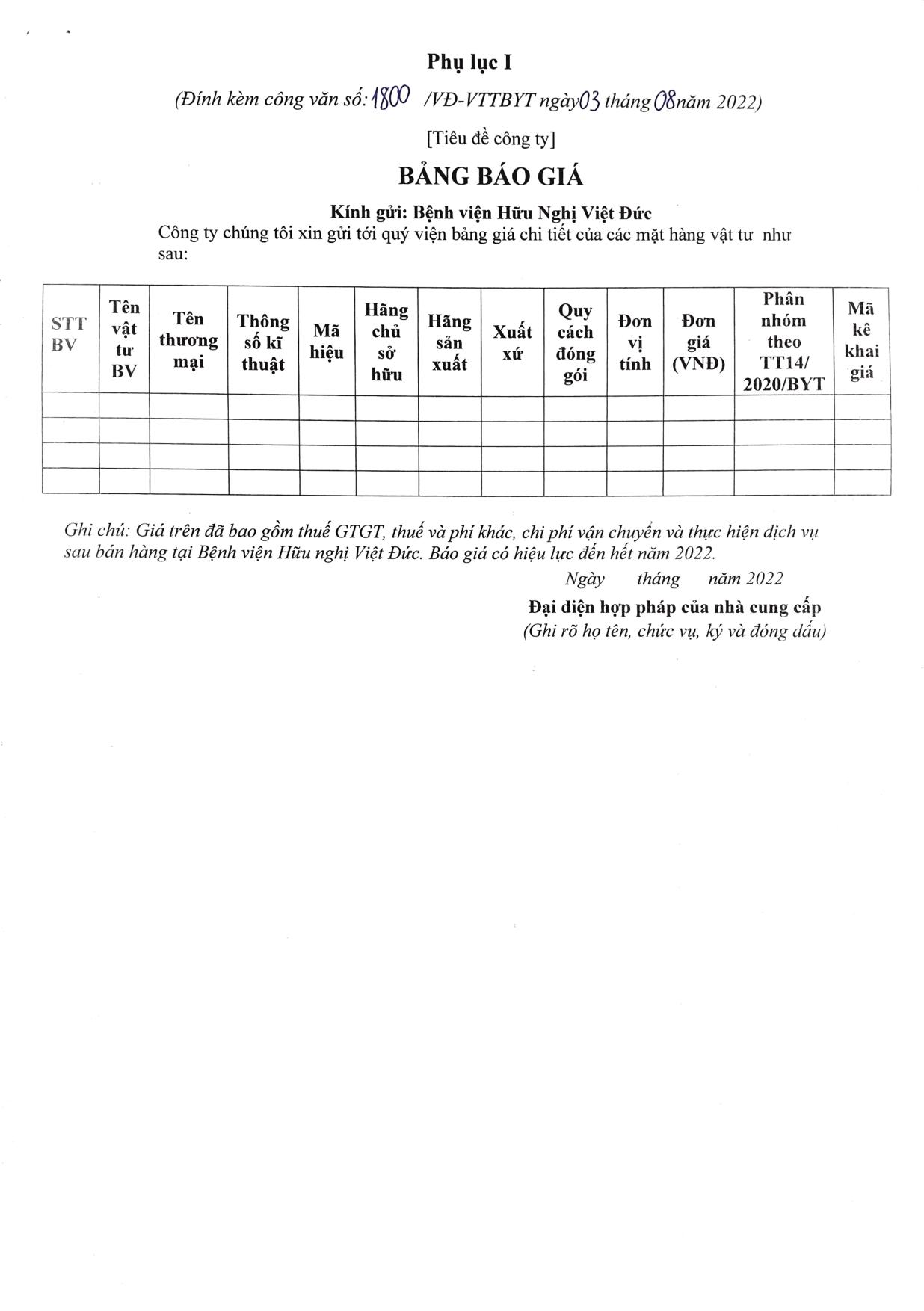 Hiện nay, Bệnh viện Hữu nghị Việt Đức đang lập kế hoạch cung cấp một số vật tư tiêu hao sử dụng cho các chuyên khoa tại Bệnh viện. Để có cơ sở tham khảo giá các mặt hàng vật tư y tế trên thị trường, Bệnh viện Hữu nghị Việt Đức kính mời các đơn vị, doanh nghiệp kinh doanh có khả năng cung cấp chào giá danh mục vật tư tiêu hao theo phụ lục đính kèm.