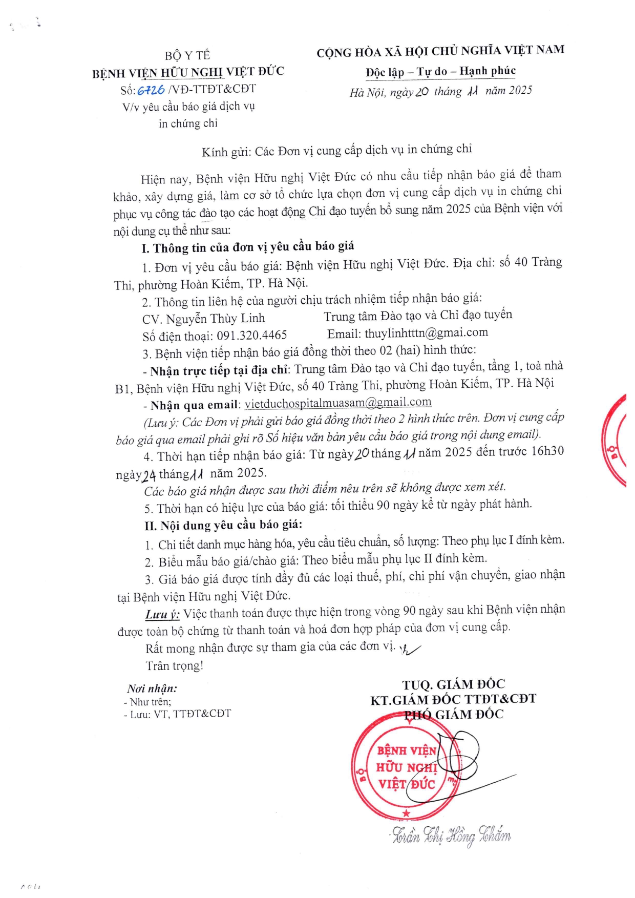 Hiện nay, Bệnh viện Hữu nghị Việt Đức đang lập kế hoạch cung cấp một số mặt hàng vật tư tiêu hao, để có cơ sở tham khảo vật tư y tế trên thị trường, Bệnh viện Hữu nghị Việt Đức kính mời các đơn vị, doanh nghiệp kinh doanh có khả năng cung cấp chào giá danh mục vật tư theo phụ lục đính kèm.