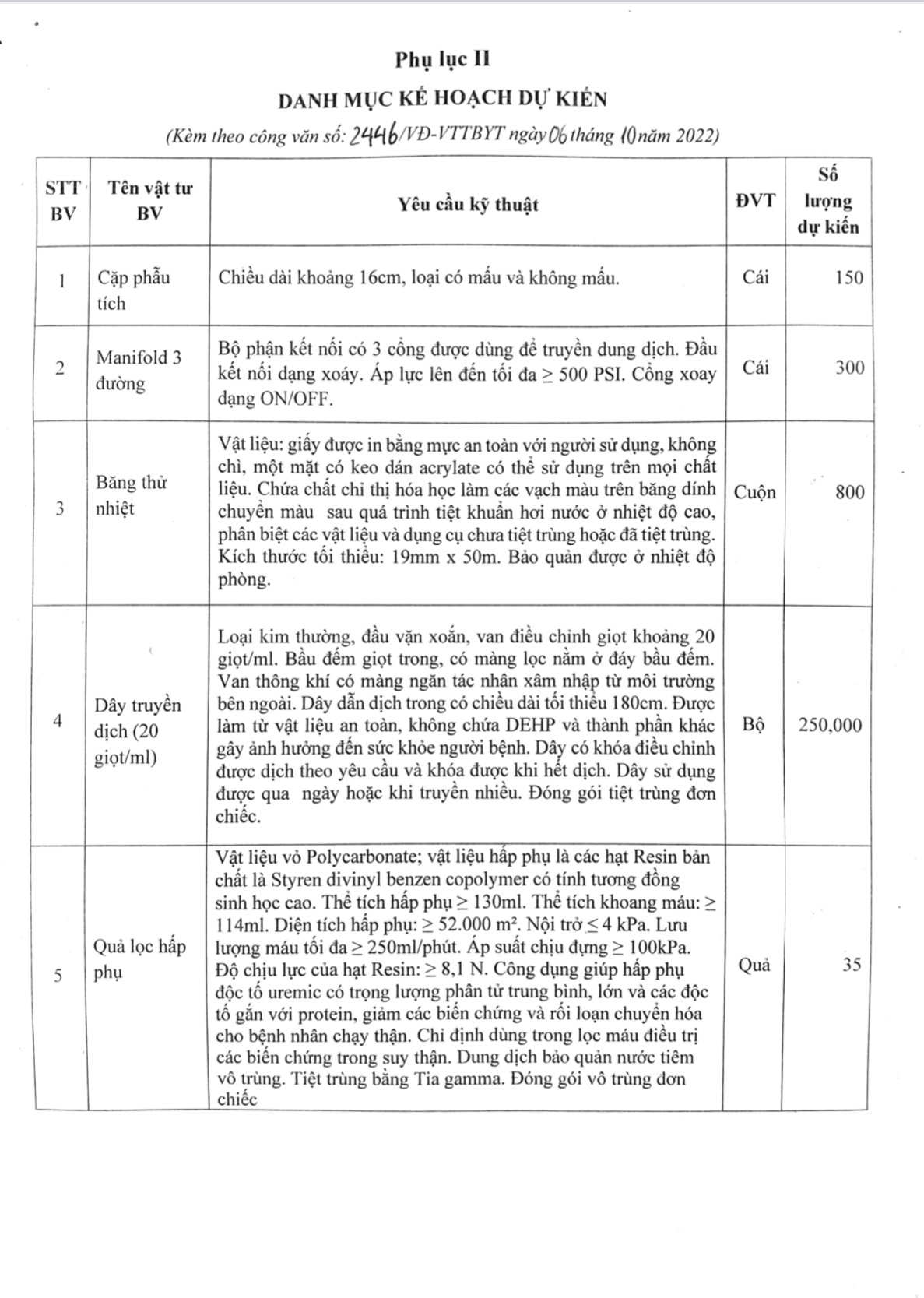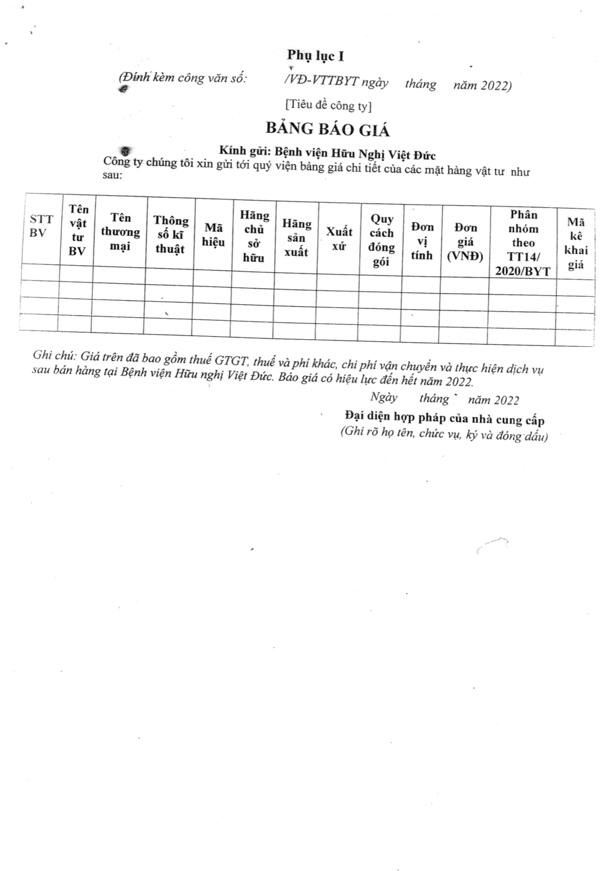 Hiện nay, Bệnh viện Hữu nghị Việt Đức đang lập kếhoạch cung cấp bổ sung một số vật tư tiêu hao sử dụng chocác chuyên khoa tại Bệnh viện. Để có cơ sở tham khảo giá cácmặt hàng vật tư y tế trên thị trường, Bệnh viện Hữu nghị ViệtĐức kính mời các đơn vị, doanh nghiệp kinh doanh có khảnăng cung cấp chào giá danh mục vật tư tiêu hao theo phụ lụcđính kèm.