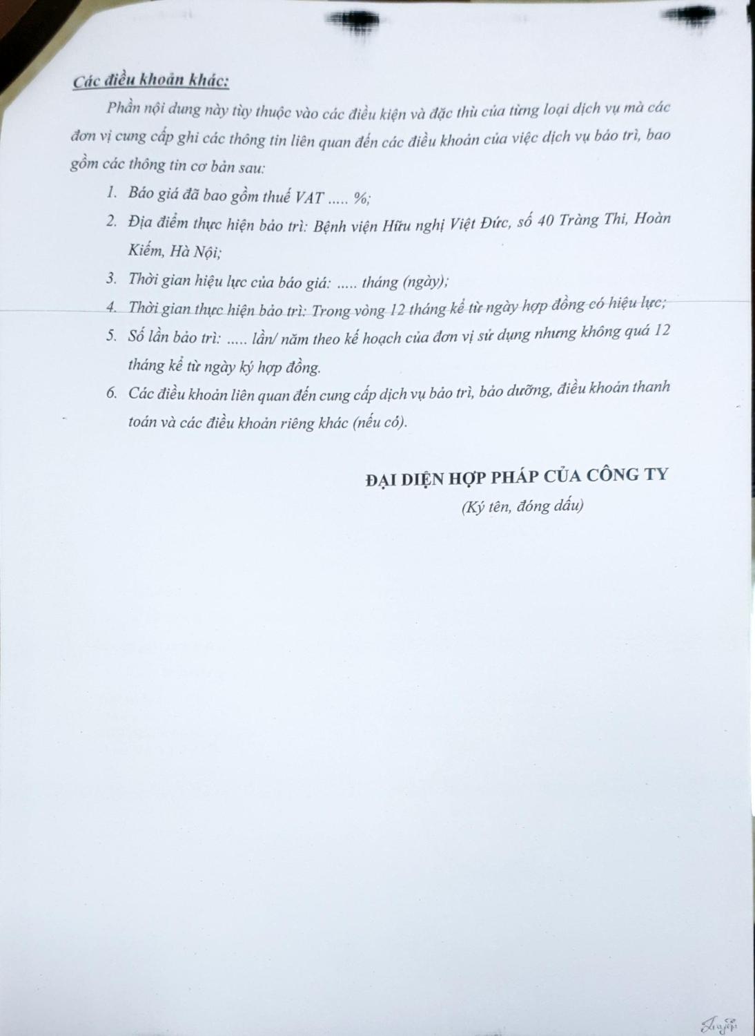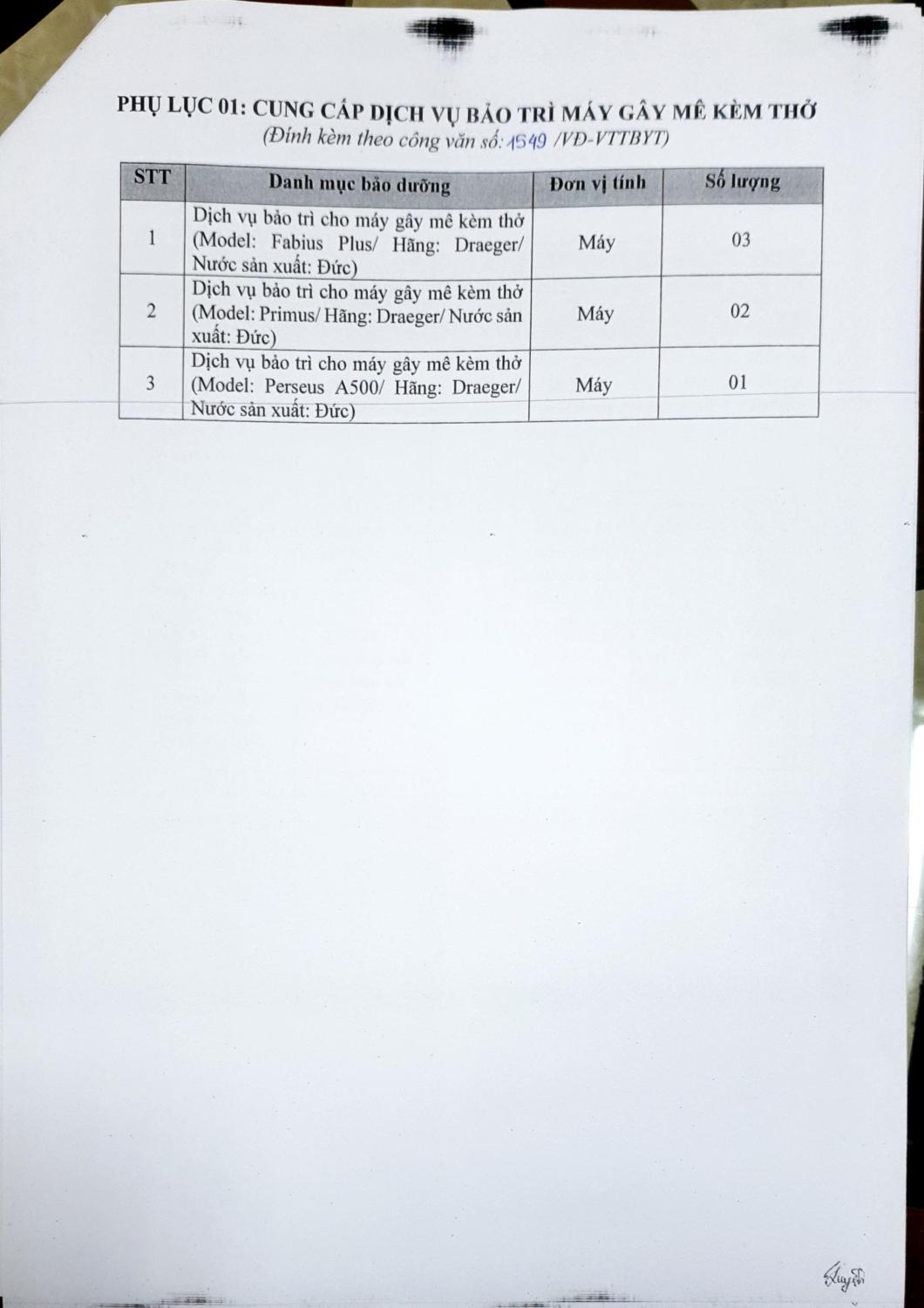 Hiện nay, Bệnh viện Hữu nghị Việt Đức đang có nhu cầu thực hiện bảo trì cho 06 máy gây mê kèm thở (Model: Fabius Plus, Primus, Perseus A500/ Hãng: Draeger/ Nước sản xuất: Đức) để phục vụ công tác chuyên môn của Bệnh viện (chi tiết nội dung tại phụ lục 01 kèm theo công văn này). Để có cơ sở xây dựng giá dự toán, Bệnh viện Hữu nghị Việt Đức mời các đơn vị, doanh nghiệp kinh doanh có khả năng cung cấp chào giá, chi tiết theo phụ lục 2 đính kèm theo công văn này.