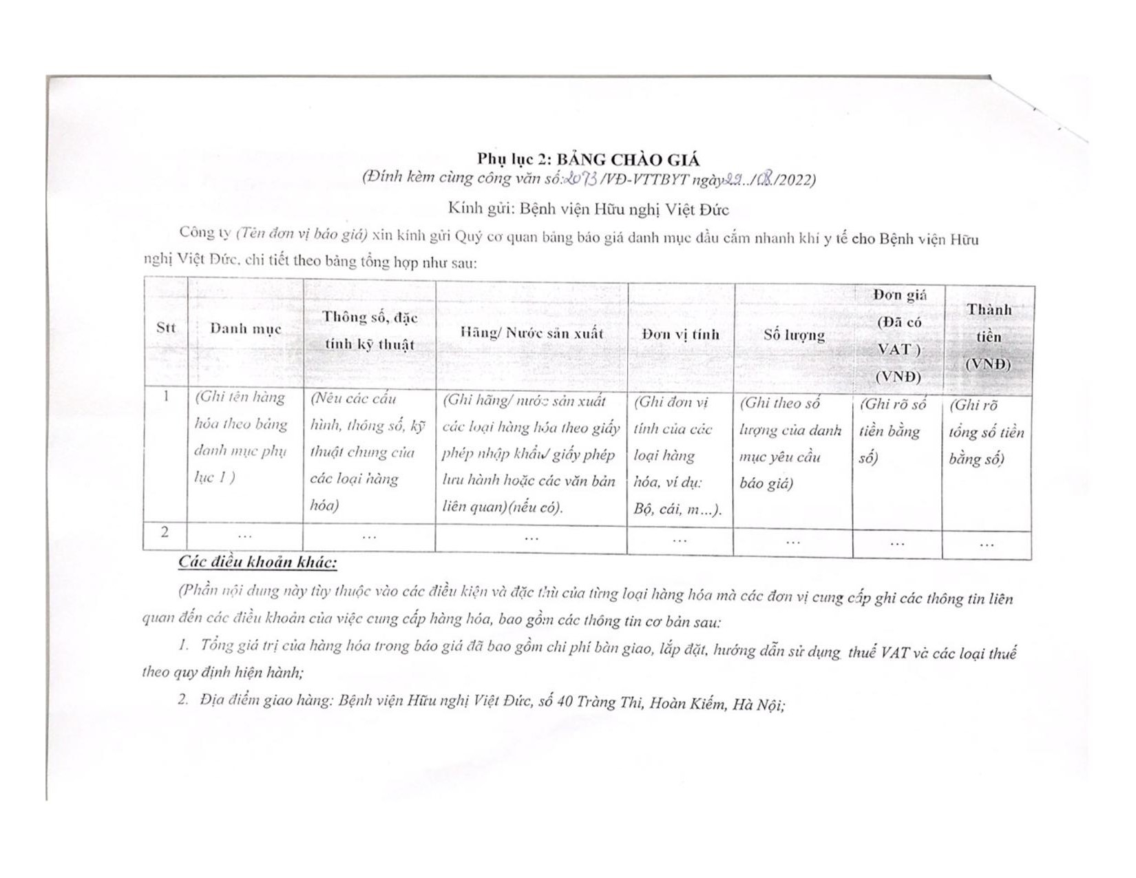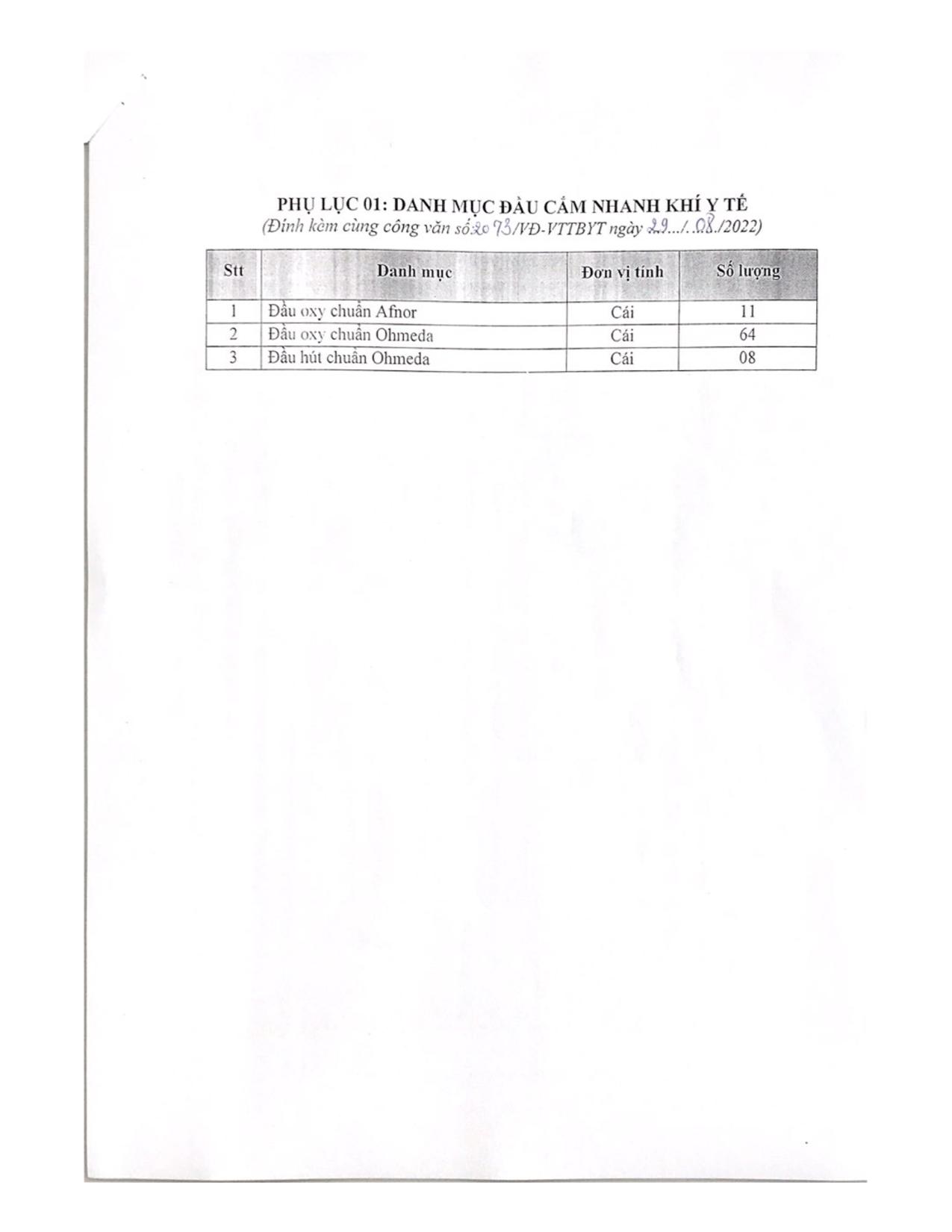 Hiện nay, Bệnh viện Hữu nghị Việt Đức đang có nhu cầu mua sắm đầu cắm nhanh khí y tế để phục vụ công tác chuyên môn của Bệnh viện. Để có cơ sở xây dựng giá dự toán, Bệnh viện Hữu nghị Việt Đức kính mời các đơn vị, doanh nghiệp kinh doanh có khả năng cung cấp chào giá đầu cắm nhanh khí y tế (chi tiết theo phụ lục 1).