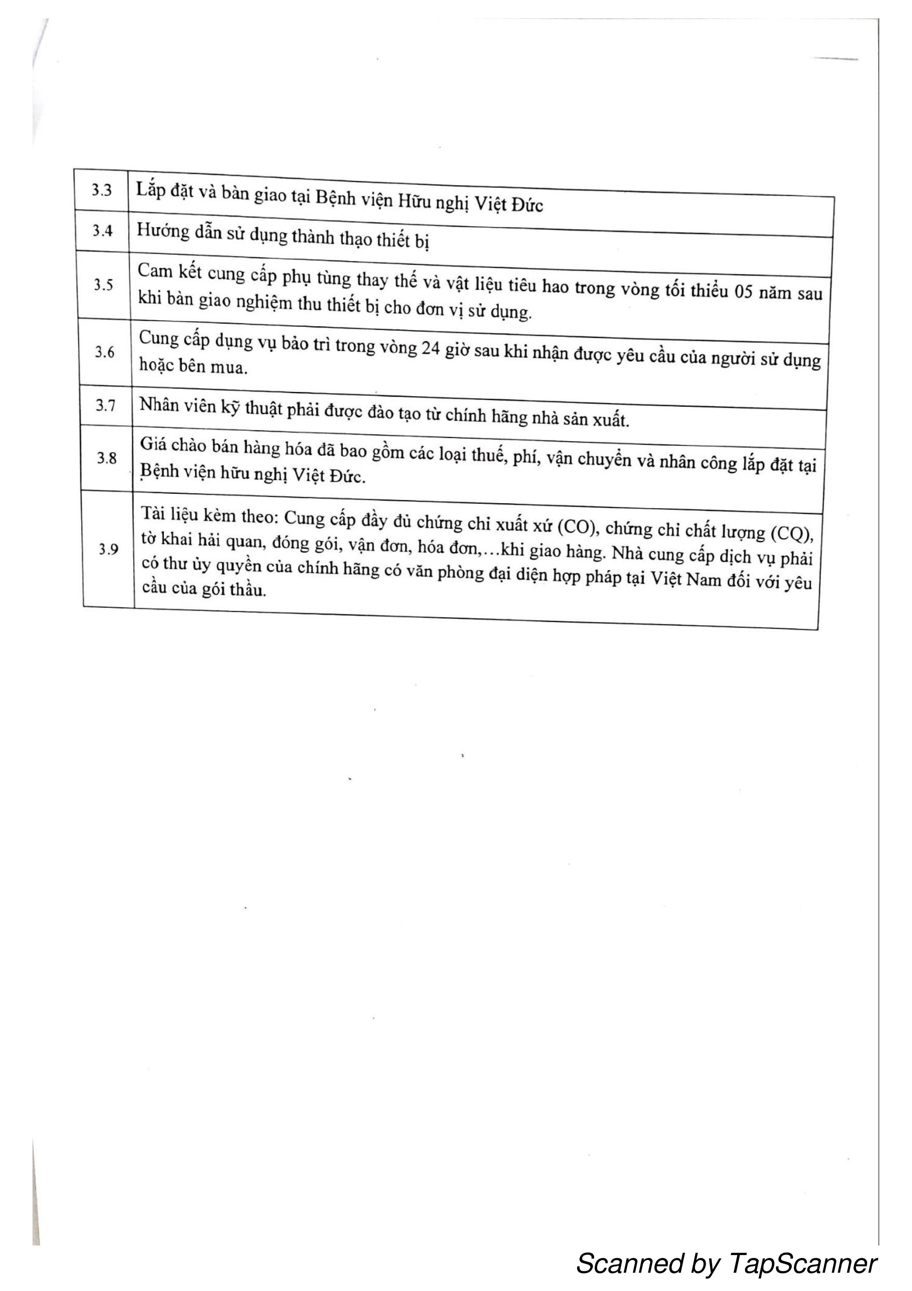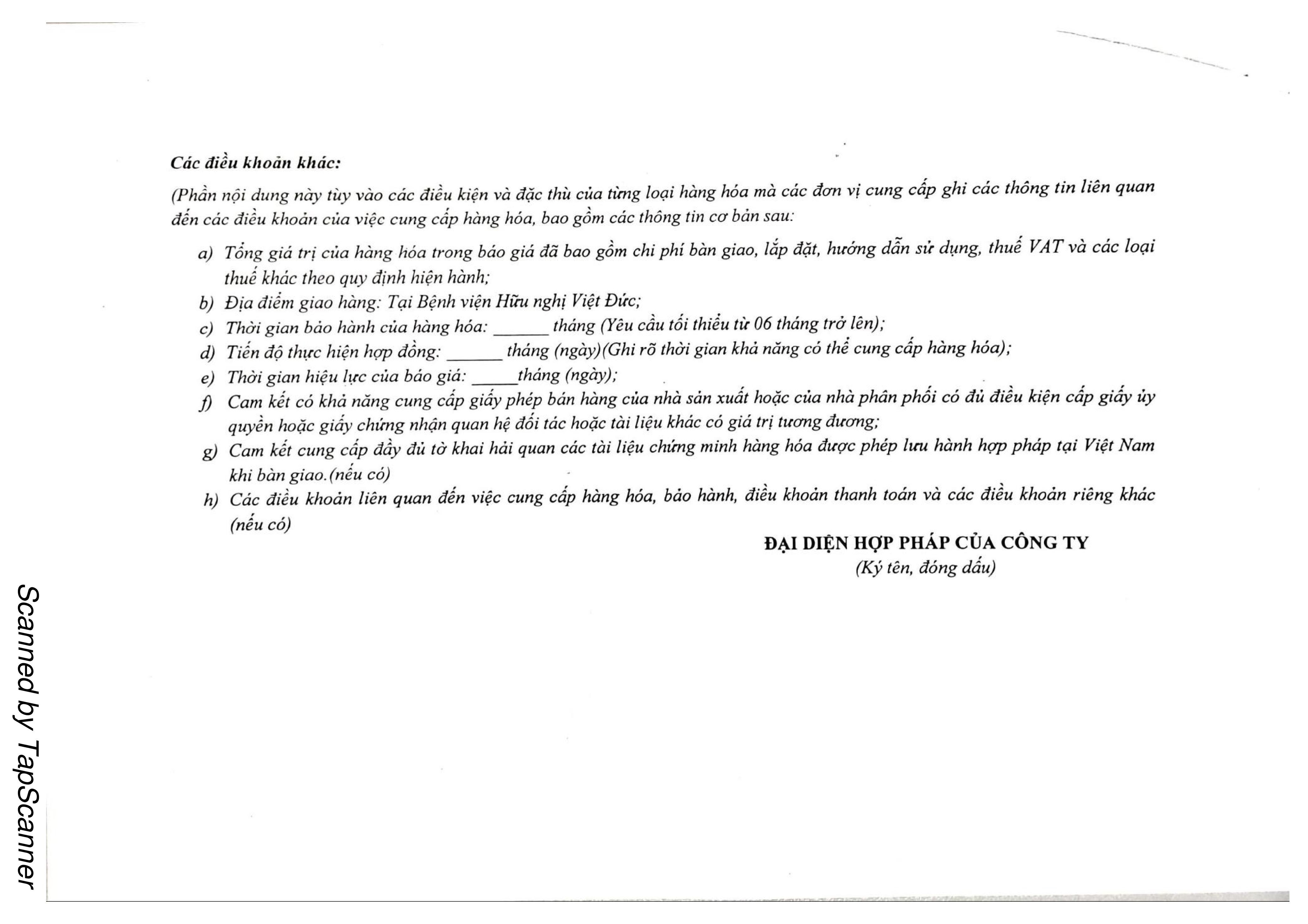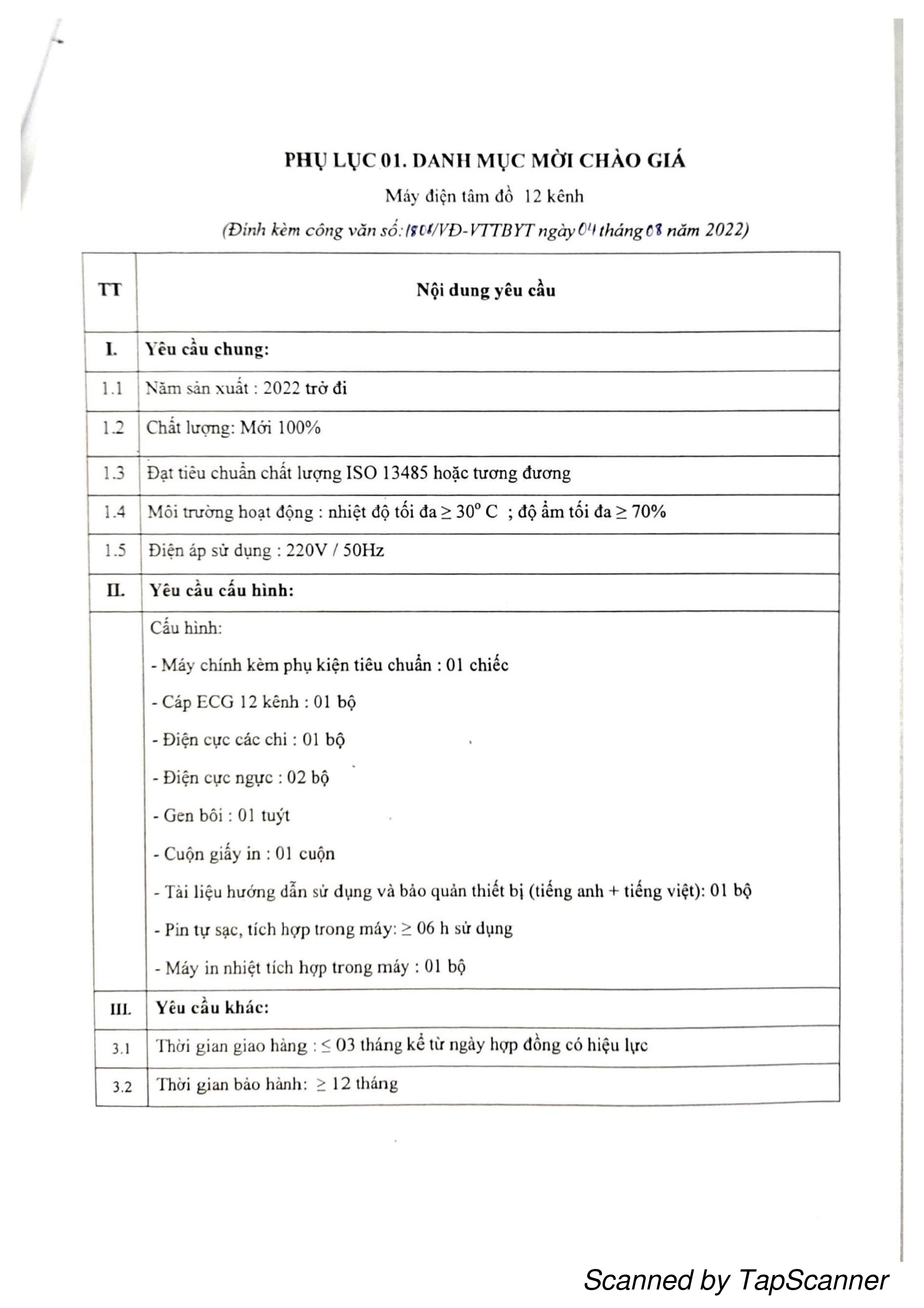 Hiện nay, Bệnh viện Hữu nghị Việt Đức đang có nhu cầu mua 01 máy điện tâm đồ 12 kênh (chi tiết nội dung tại phụ lục 1 kèm theo), để có cơ sở tham khảo giá trên thị trường, Bệnh viện Hữu nghị Việt Đức mời các đơn vị, doanh nghiệp kinh doanh có khả năng cung cấp chào giá theo phụ lục 2 đính kèm.