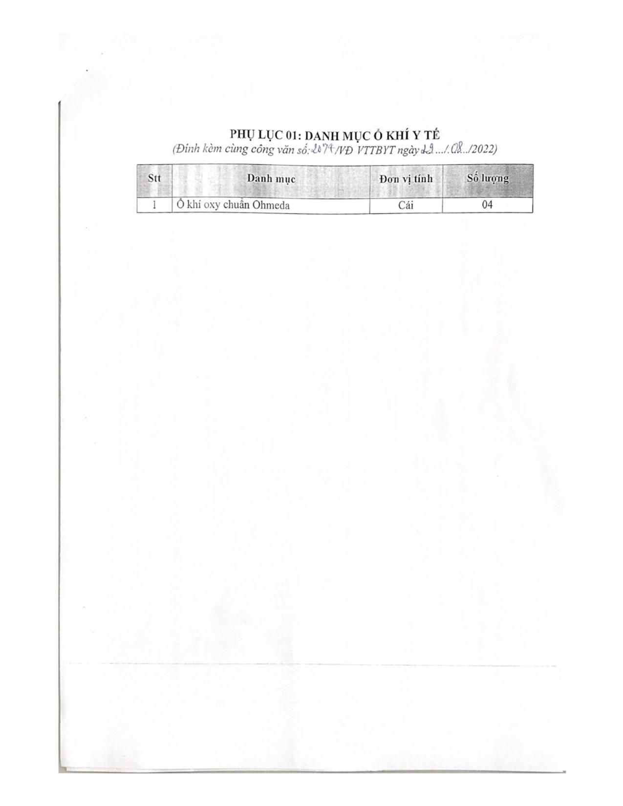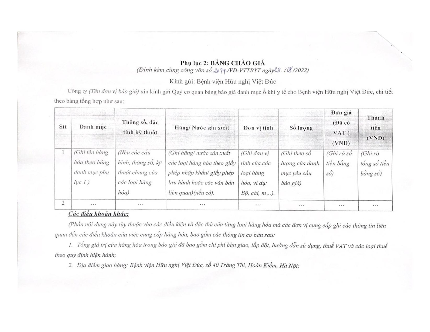 Hiện nay, Bệnh viện Hữu nghị Việt Đức đang có nhu cầu mua sắm các ổ khí y tế để phục vụ công tác chuyên môn của Bệnh viện. Để có cơ sở xây dựng giá dự toán, Bệnh viện Hữu nghị Việt Đức kính mời các đơn vị, doanh nghiệp kinh doanh có khả năng cung cấp chào giá ổ khí y tế (chi tiết theo phụ lục 1).