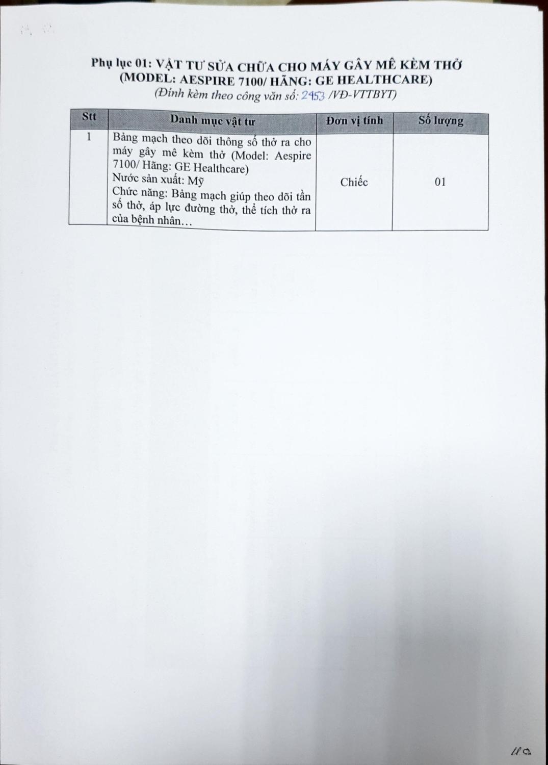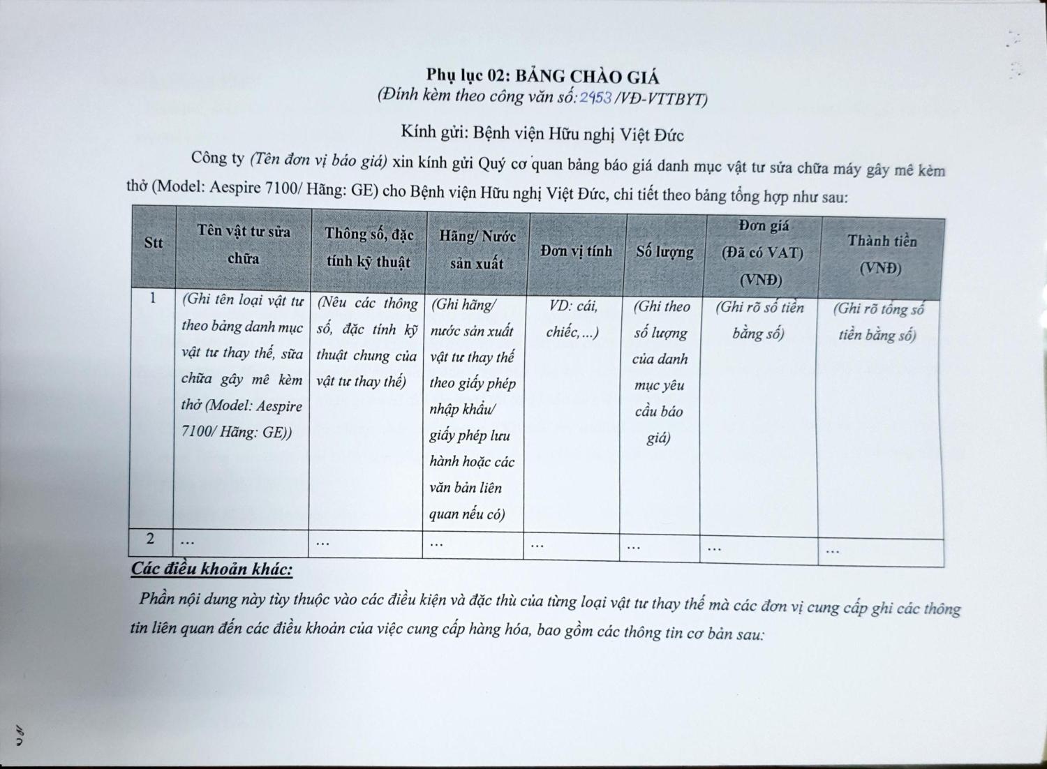 Hiện nay, Bệnh viện Hữu nghị Việt Đức đang có nhu cầu sửa 01 máy thở (Model: Aespire 7100/ Hãng: GE) để phục vụ công tác chuyên môn của Bệnh viện, chi tiết nội dung tại phụ lục kèm theo công văn này. Để có cơ sở tham khảo giá các đơn vị có khả năng cung cấp vật tư sửa chữa y tế trên thị trường, Bệnh viện Hữu nghị Việt Đức mời các đơn vị, doanh nghiệp kinh doanh có khả năng sửa chữa chào giá theo phụ lục 2 đính kèm.