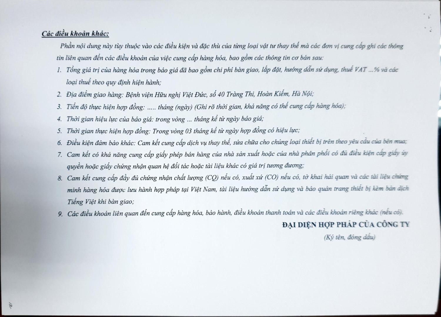Bệnh viện Hữu nghị Việt Đức mời chào báo giá thiết bị y tế