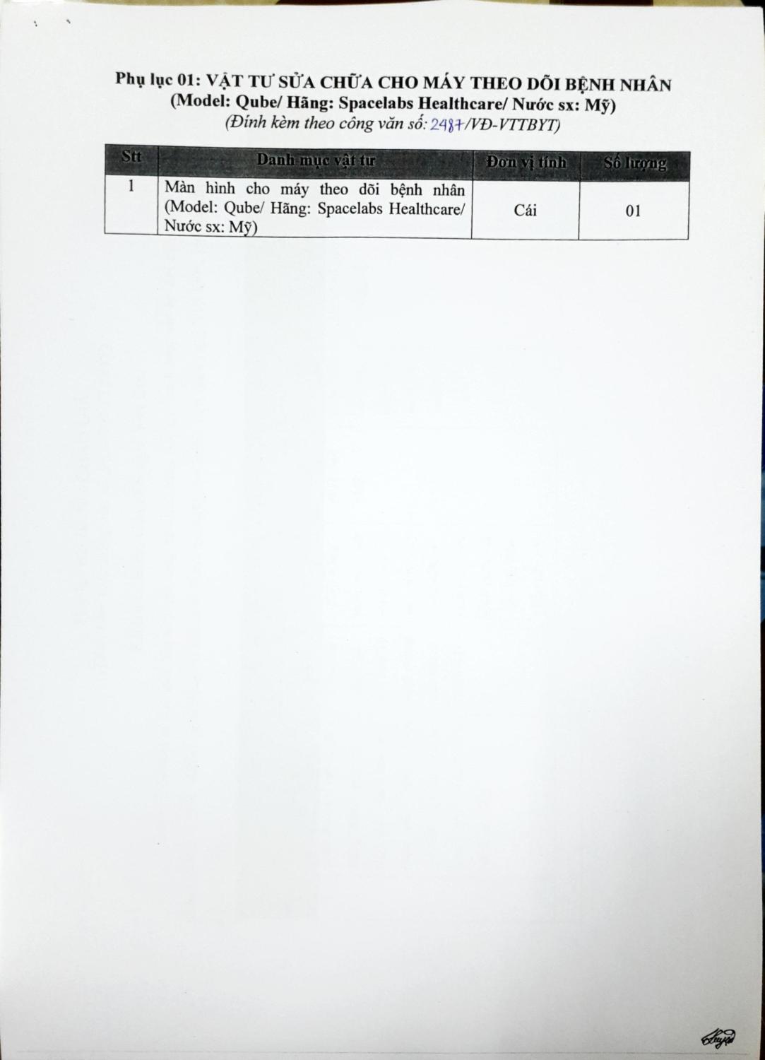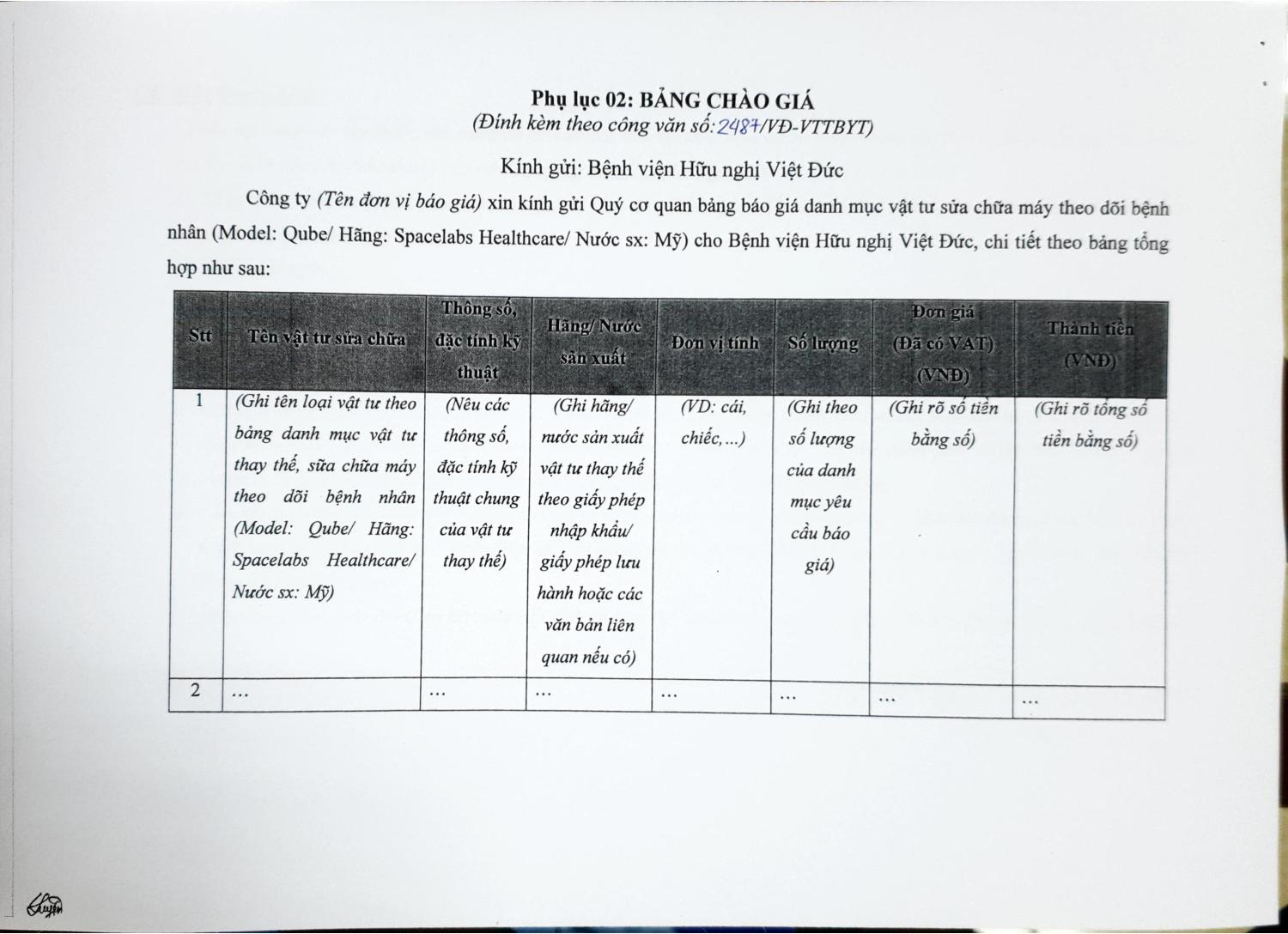 Hiện nay, Bệnh viện Hữu nghị Việt Đức đang có nhu cầu sửa 01 máy theo dõi bệnh nhân (Model: Qube/ Hãng: Spacelabs Healthcare/ Nước sx: Mỹ) để phục vụ công tác chuyên môn của Bệnh viện, chi tiết nội dung tại phụ lục kèm theo công văn này. Để có cơ sở tham khảo giá các đơn vị có khả năng cung cấp vật tư sửa chữa y tế trên thị trường, Bệnh viện Hữu nghị Việt Đức mời các đơn vị, doanh nghiệp kinh doanh có khả năng sửa chữa chào giá theo phụ lục 2 đính kèm.
