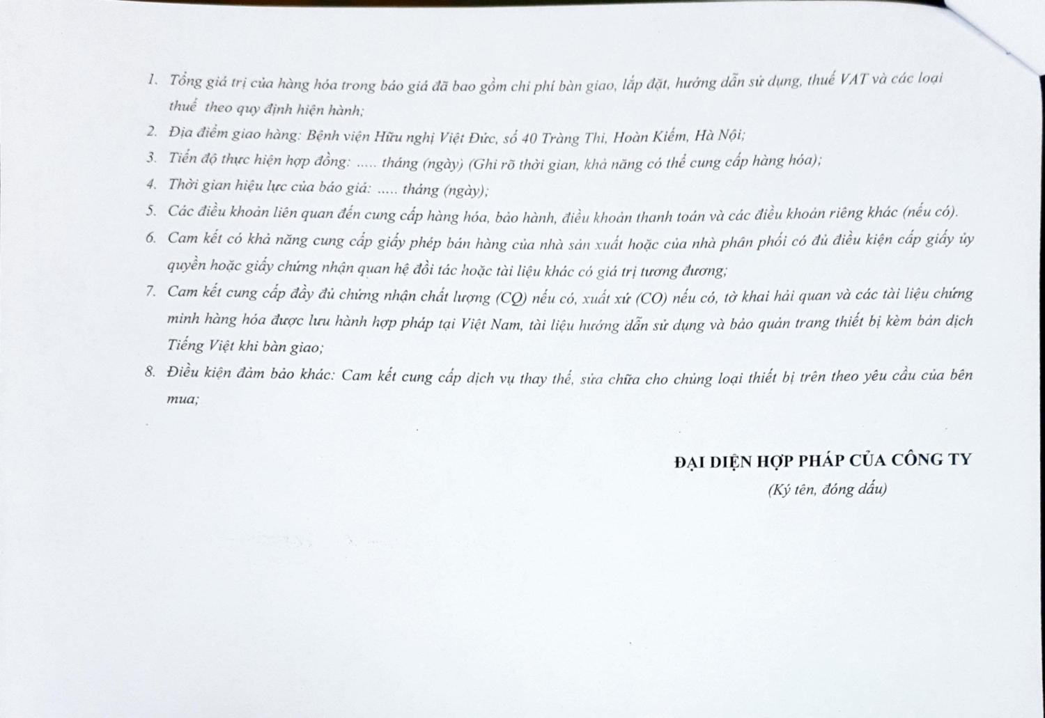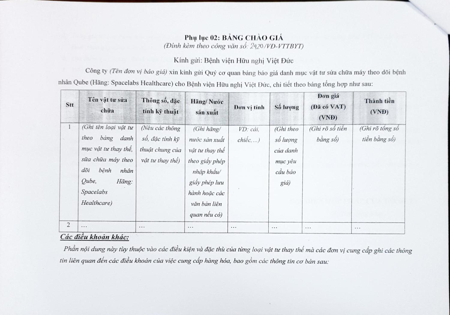 Hiện nay, Bệnh viện Hữu nghị Việt Đức đang có nhu cầu sử dụng 01 máy theo dõi bệnh nhân Qube (Hãng: Spacelabs Healthcare) để phục vụ công tác chuyên môn của bệnh viện, chi tiết nội dung tại phụ lục kèm theo công văn này.