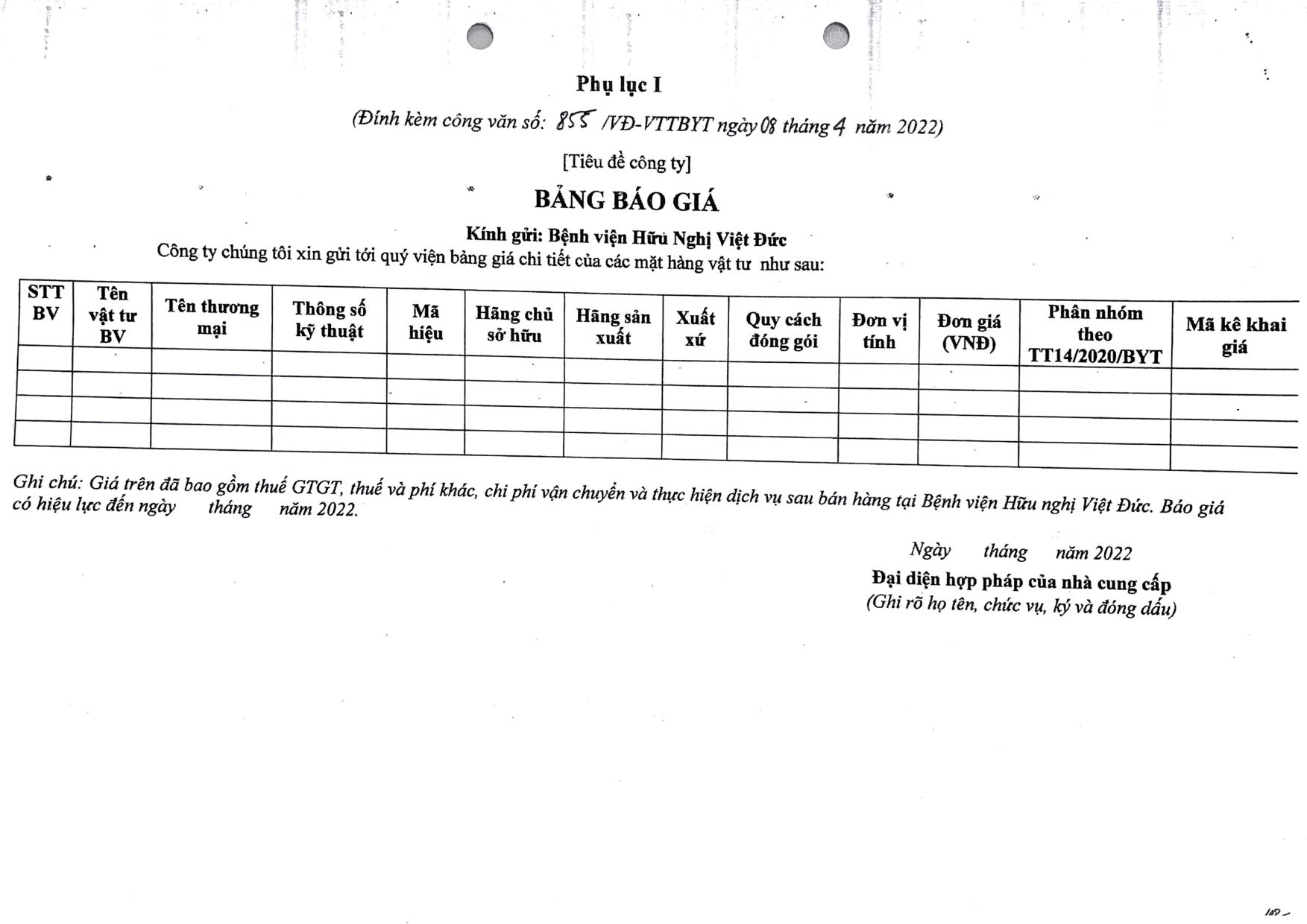 Hiện nay, Bệnh viện Hữu nghị Việt Đức đang lập kế hoạch mua sắm vật tư tiêu hao để phục vụ công tác chuyên môn tại Bệnh viện. Để có cơ sở tham khảo giá các mặt hàng này trên thị trường, Bệnh viện Hữu nghị Việt Đức kính mời các đơn vị, doanh nghiệp kinh doanh có khả năng cung cấp chào giá danh mục vật tư tiêu hao theo phụ lục đính kèm.