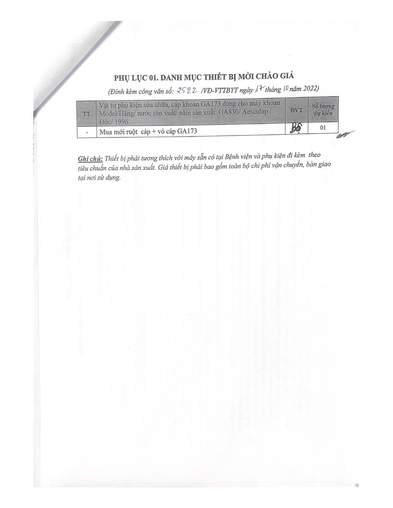 Hiện nay, Bệnh viện Hữu nghị Việt Đức đang có nhu cầu mua vật tư phục vụ sửa chữa cáp khoan GA173 dùng cho máy khoan Model/Hãng/ nước sản xuất/ năm sản xuất: GA830/ Aesculap / Đức 1996 cụ thể như sau: