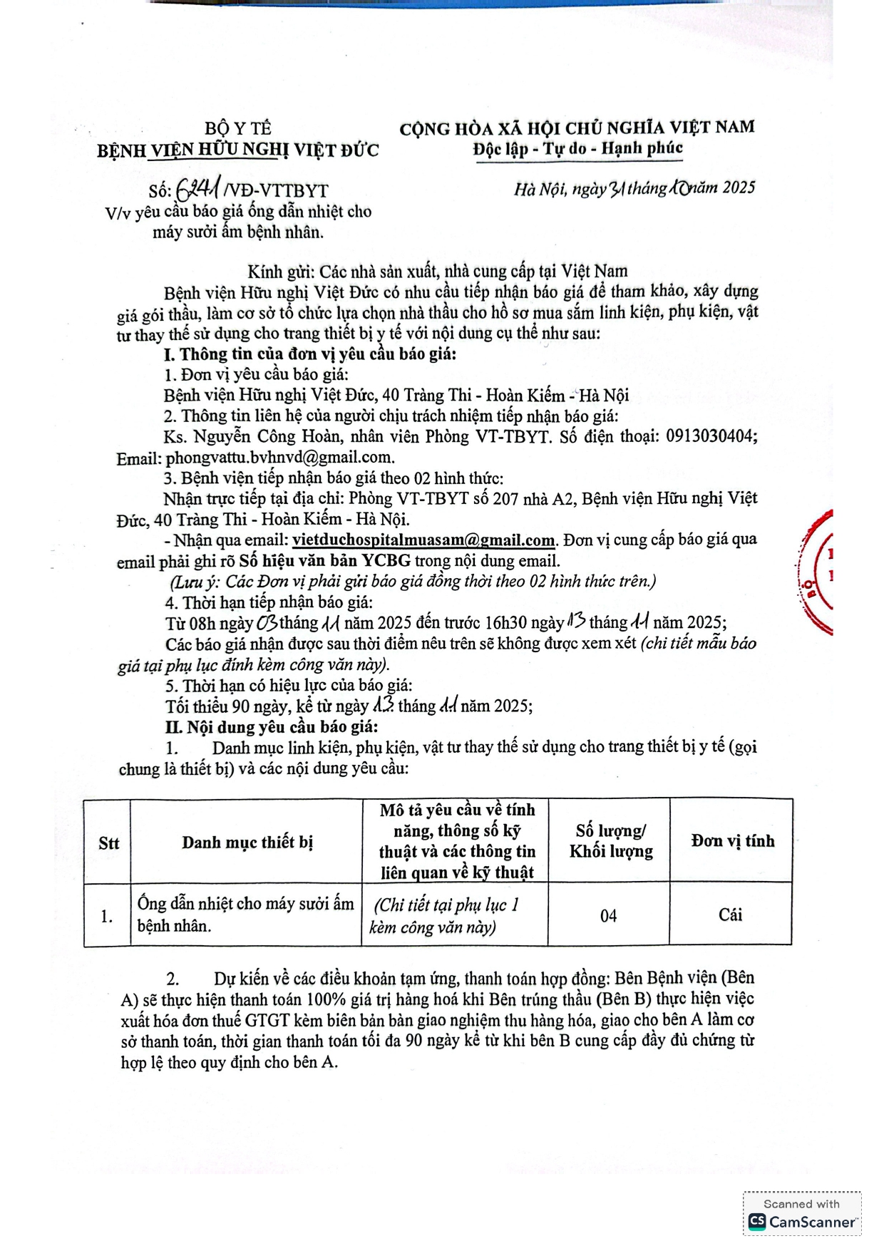 Bệnh viện Hữu nghị Việt Đức mời chào báo giá ống dẫn nhiệt cho máy sưởi ấm bệnh nhân