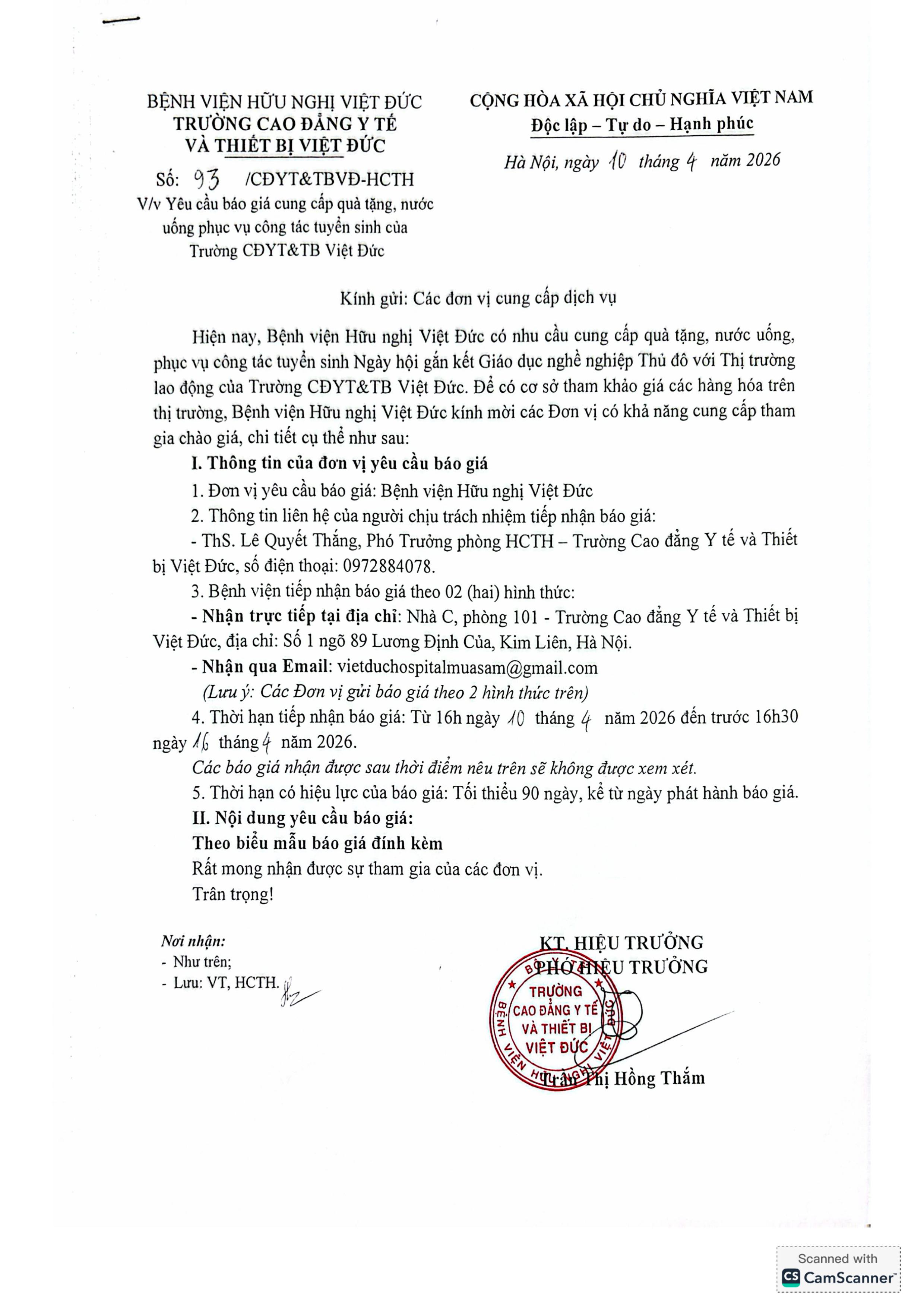 Bệnh viện Hữu nghị Việt Đức có nhu cầu báo giá cung cấp quà tặng, nước uống phục vụ công tác tuyển sinh của Trường CĐYT&TB Việt Đức