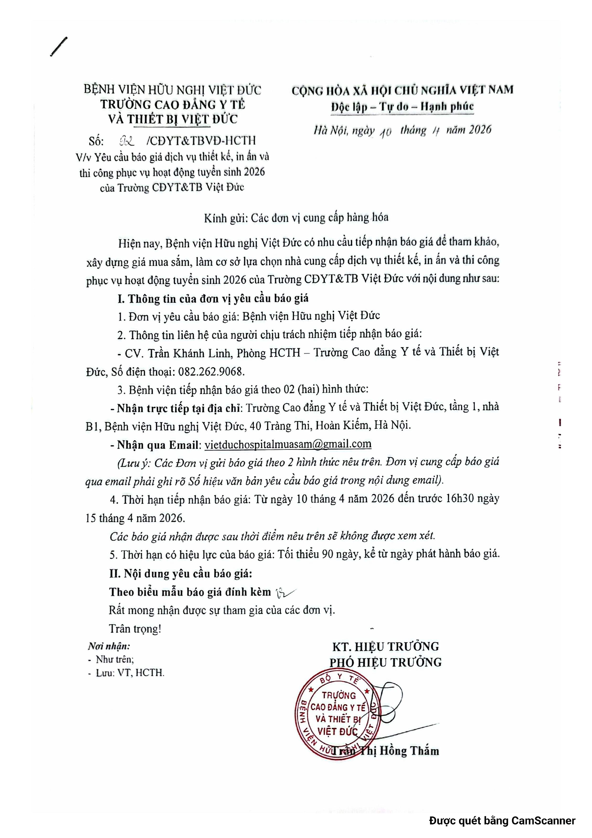 Bệnh viện Hữu nghị Việt Đức có nhu cầu báo giá cung cấp dịch vụ Photocopy thông báo tuyển sinh của Trường CĐYT&TB Việt Đức