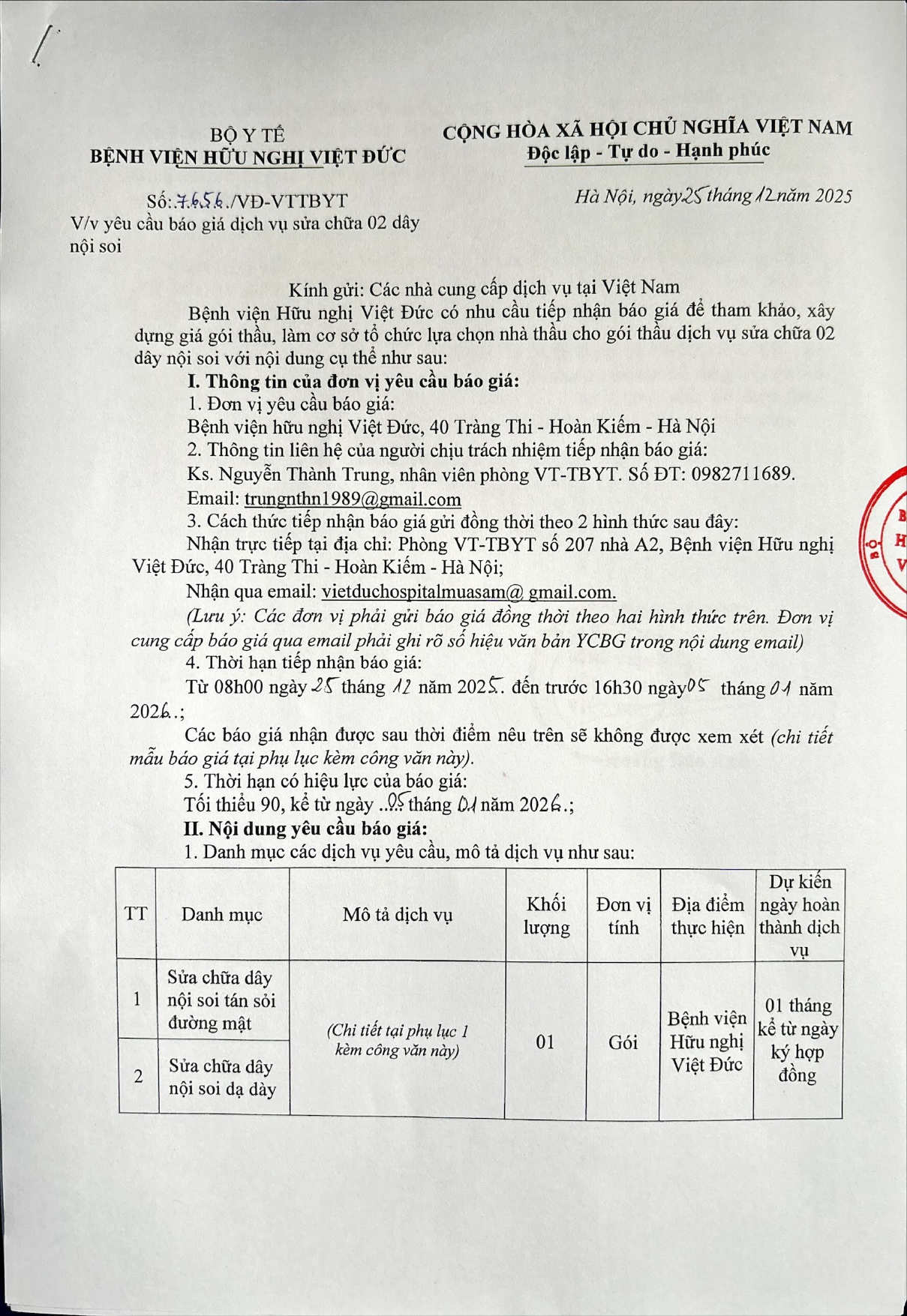 Hiện nay, Bệnh viện Hữu nghị Việt Đức đang có nhu cầu sửa chữa bảng điều khiển đèn của hệ thống OR1 (chi tiết nội dung tại phụ lục 1),…
