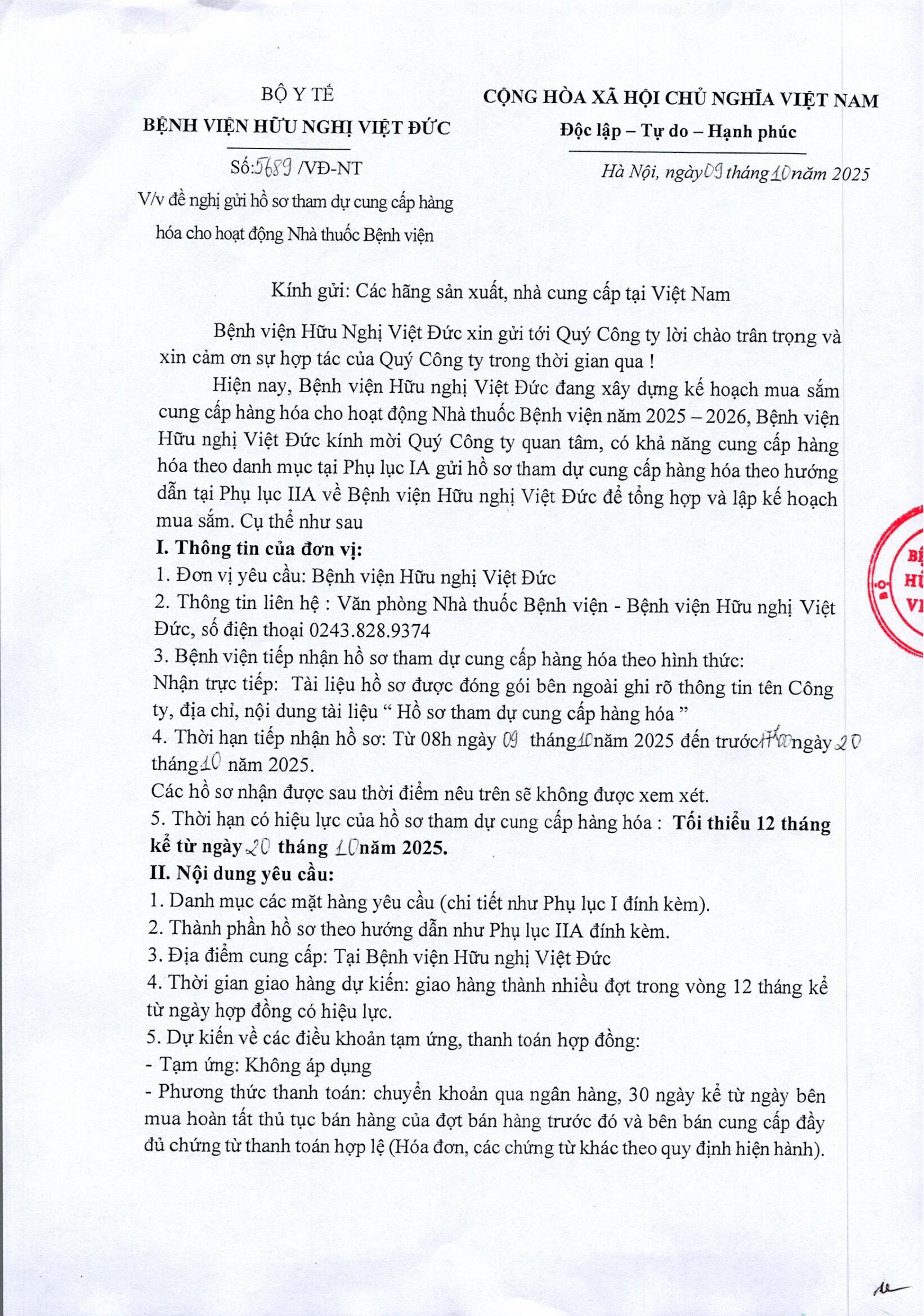 Bệnh viện Hữu nghị Việt Đức có nhu cầu cung cấp hàng hóa cho hoạt động Nhà thuốc Bệnh viện