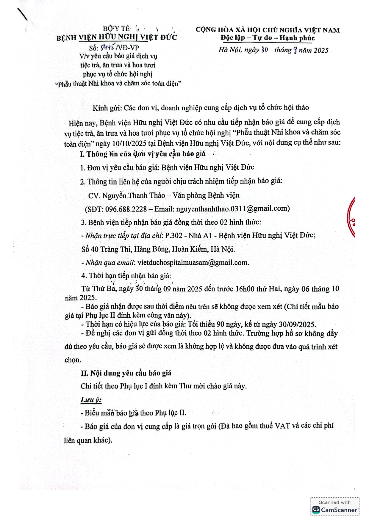 Hiện nay, Bệnh viện Hữu nghị Việt Đức có nhu cầu tiếp nhận báo giá để cung cấp dịch vụ tiệc trà, ăn trưa và hoa tươi phục vụ tổ…