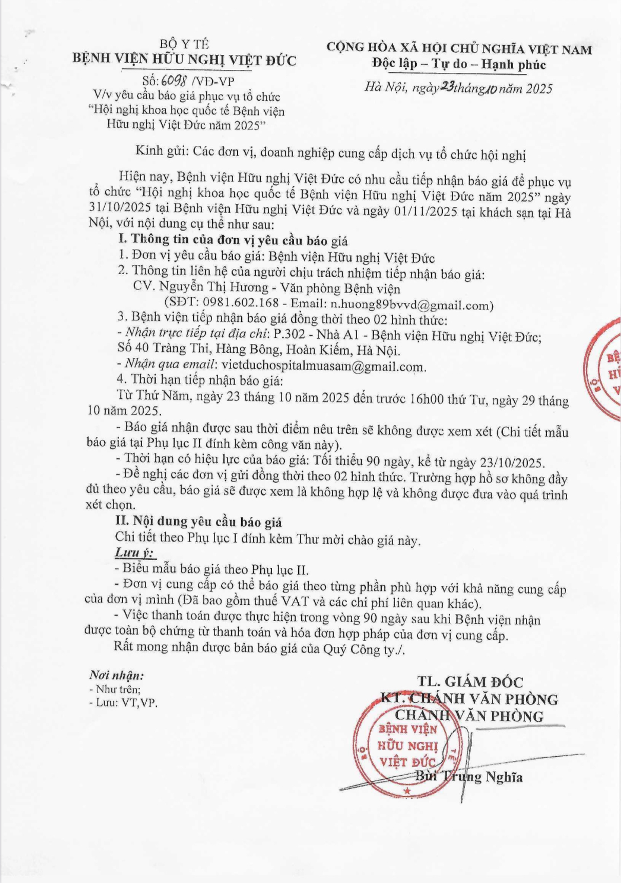Bệnh viện Hữu nghị Việt Đức mời báo giá phục vụ tổ chức “Hội nghị khoa học quốc tế Bệnh viện Hữu nghị Việt Đức năm 2025”
