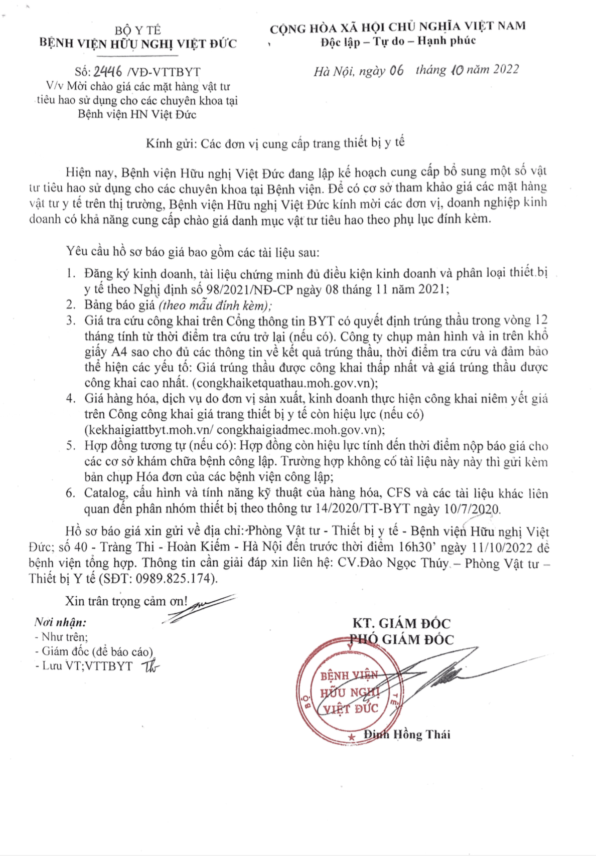 Bệnh viện Hữu nghị Việt Đức mời chào giá các mặt hàng vật tư tiêu hao sử dụng cho các chuyên khoa