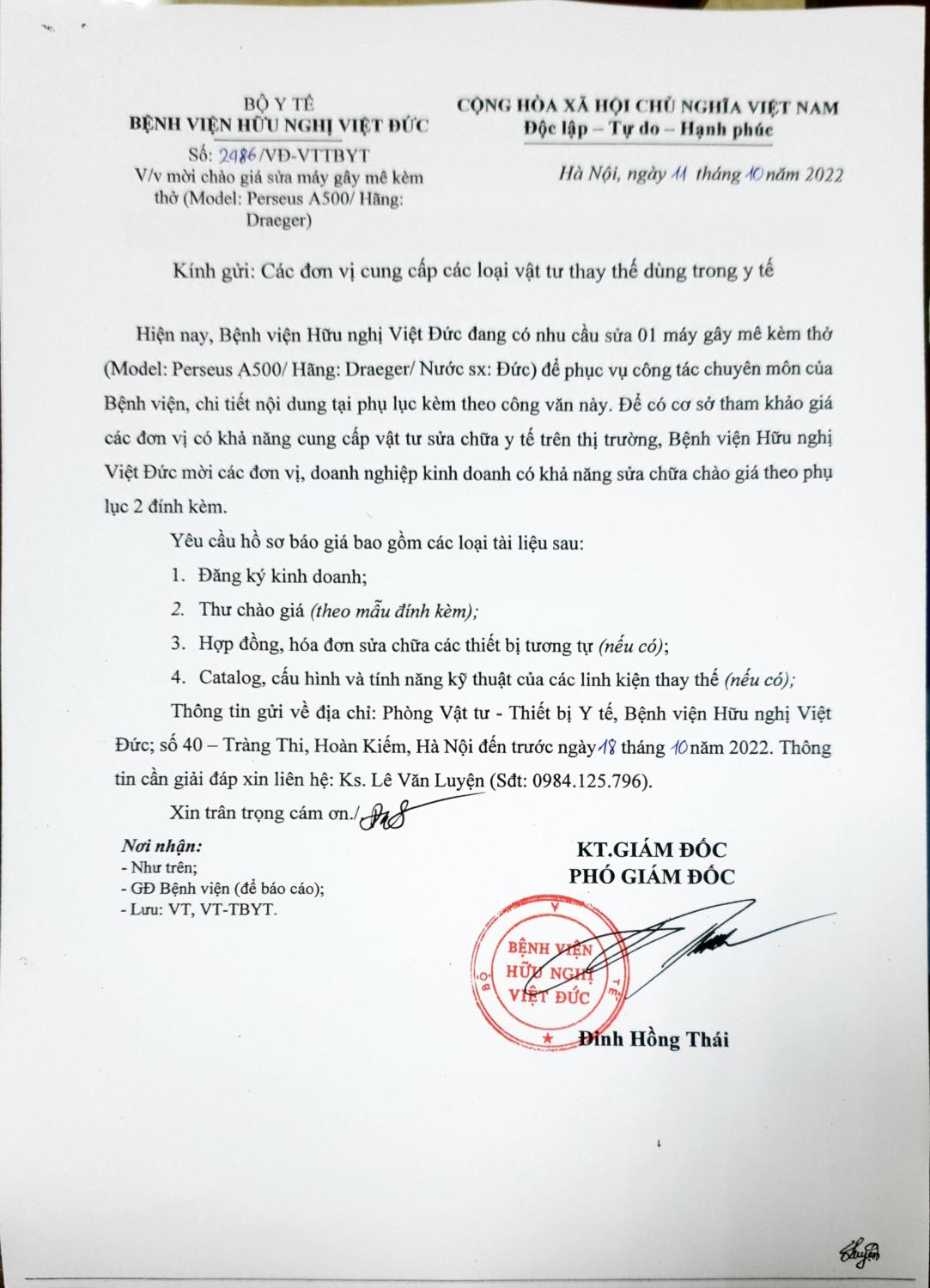 Hiện nay, Bệnh viện Hữu nghị Việt Đức đang có nhu cầu sửa 01 máy gây mê kèm thở (Model: Perseus A500/ Hãng: Draeger/ Nước sx: Đức) để phục vụ…