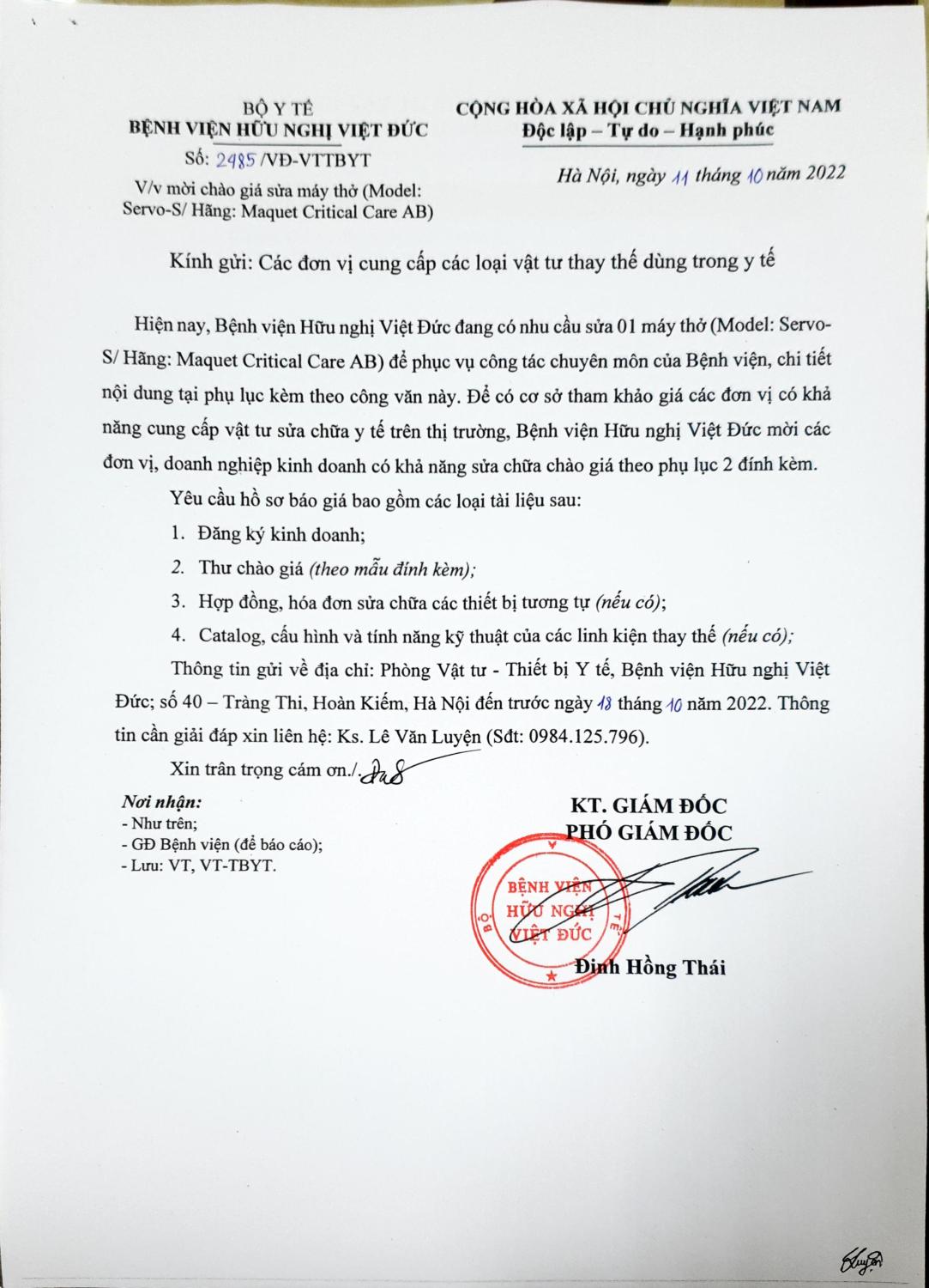 Bệnh viện Việt Đức mời chào giá sửa máy thở (Model: Servo-S/ Hãng: Maquet Critical Care AB)