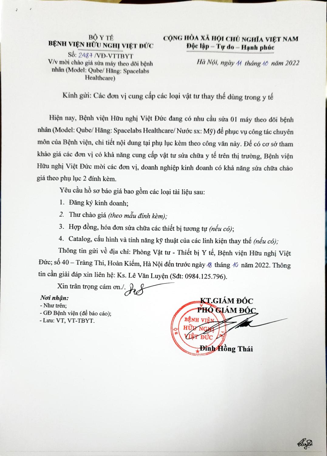 Bệnh viện Việt Đức mời chào giá sửa máy theo dõi bệnh nhân (Model: Qube/ Hãng: Spacelabs Healthcare)