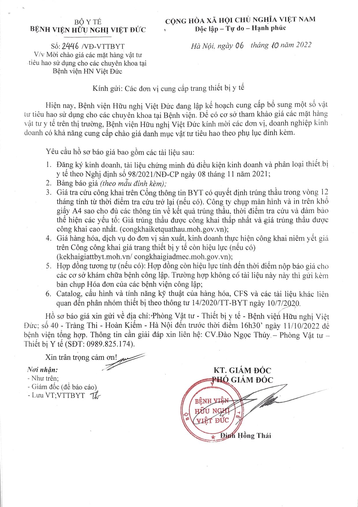 Bệnh viện Việt Đức mời chào giá các mặt hàng vật tư tiêu hao sử dụng cho các chuyên khoa