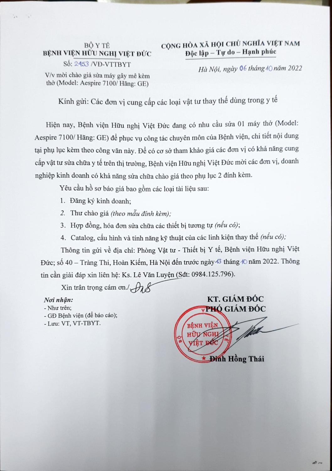 Hiện nay, Bệnh viện Hữu nghị Việt Đức đang có nhu cầu sửa 01 máy thở (Model: Aespire 7100/ Hãng: GE) để phục vụ công tác chuyên môn của Bệnh…