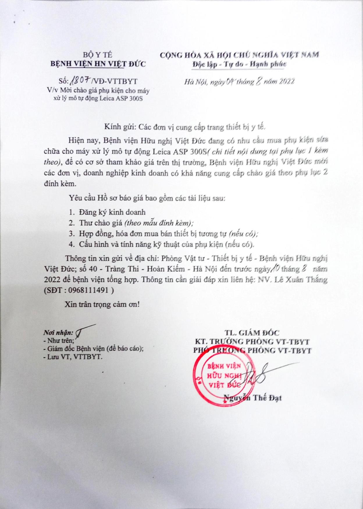 Bệnh viện Hữu nghị Việt Đức mời chào giá phụ kiện cho máy xử lý mô tự động Leica ASP 300S