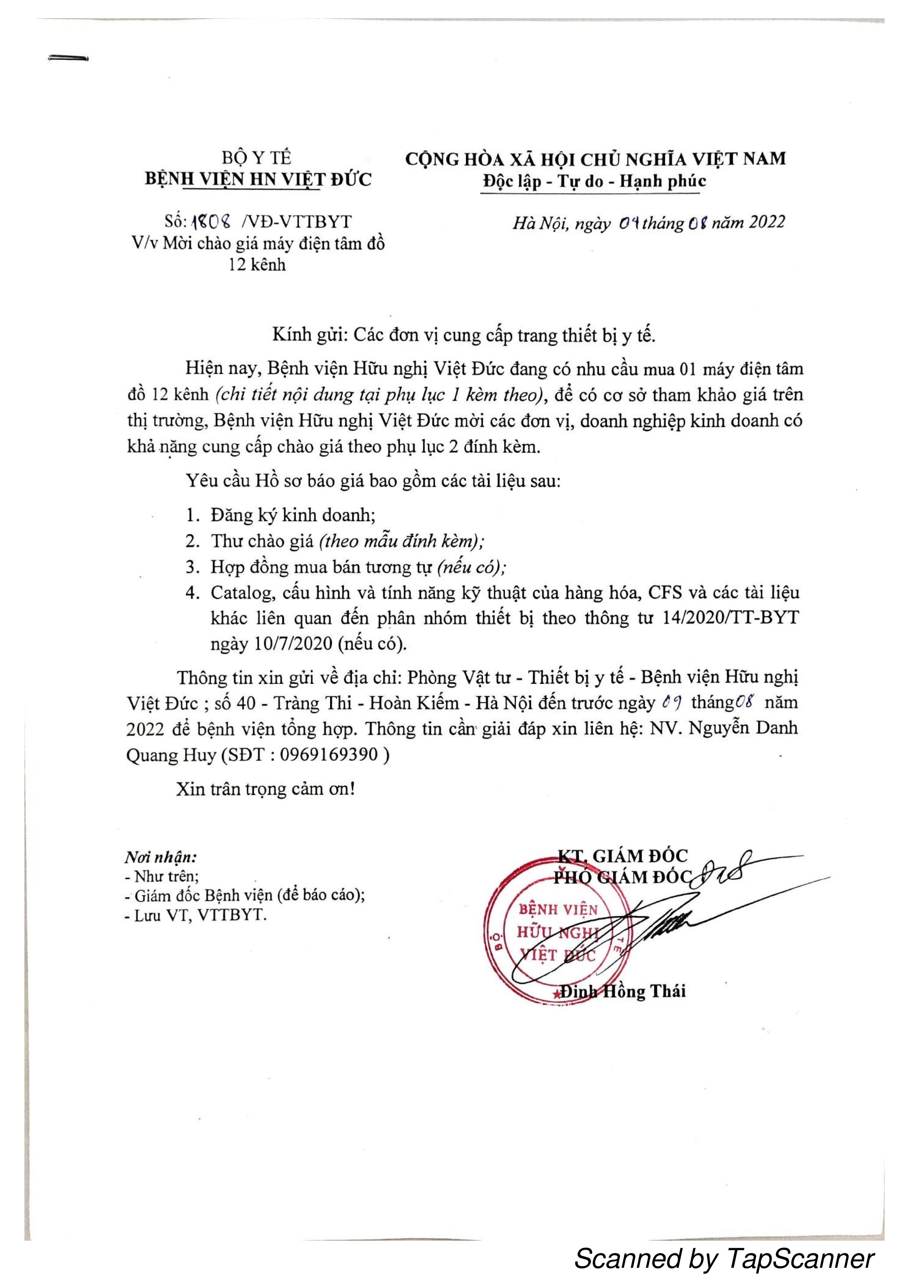 Hiện nay, Bệnh viện Hữu nghị Việt Đức đang có nhu cầu mua 01 máy điện tâm đồ 12 kênh (chi tiết nội dung tại phụ lục 1 kèm theo),…